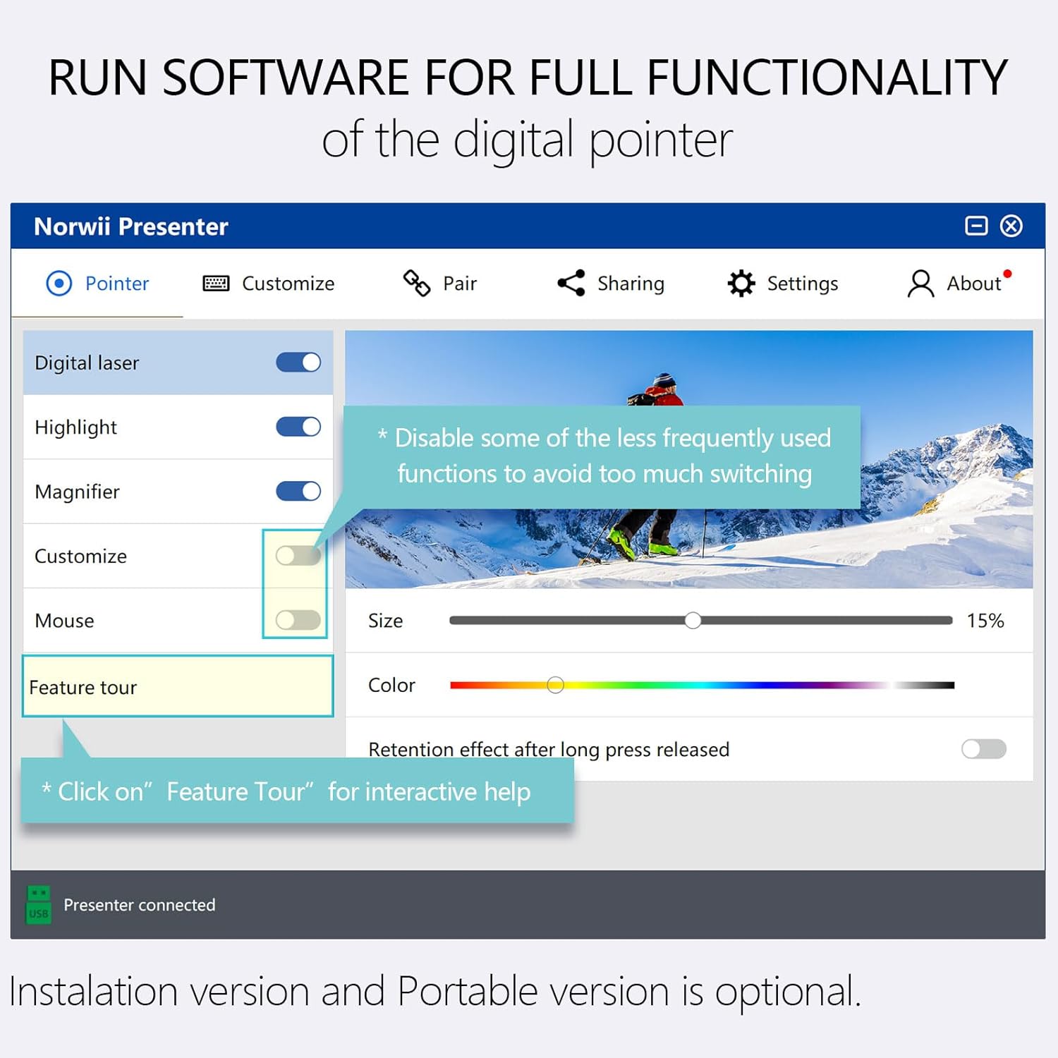 - Powerful features - ①Advanced features such as Digital Pointer, Highlight, Magnify, Annotate allow for rich content interaction during your presentations. Tips: Advanced functions are enabled via Norwii Presenter software preloaded in the USB receiver. ②Basic functions of the wireless presenter cover your daily presentations: Physical pointer, page forward/backward, black/full screen, volume control, left mouse click