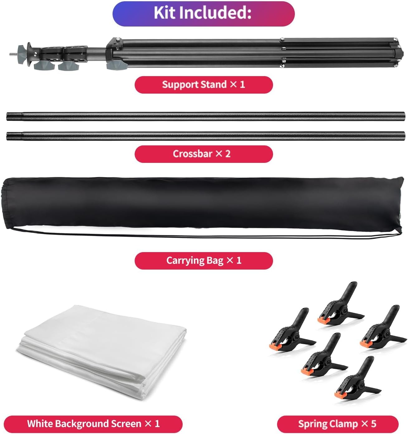 - Package Contents: (1 x) Height 6.5 ft Support Stand / (2 x) Width 2.7 ft Crossbars / (1 x) 6.5 x 10 ft White Photo Backdrop / (5 x) Spring Clamps / (1 x) Carrying Bag for backdrop stand / (1 x) User Manual