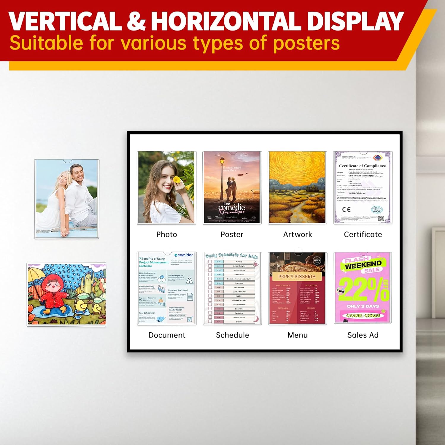 - 【DOUBLE-SIDED DISPLAY】Double-sided visibility design of reusable adhesive frames allows people to view content of posters from both sides on any transparent surface. Magnetic picture frames can display your posters horizontally or vertically according to your needs. Magnetic paper holder is 0.04” thick and can hold about 4 sheets of 8 1/2 x 11 paper.