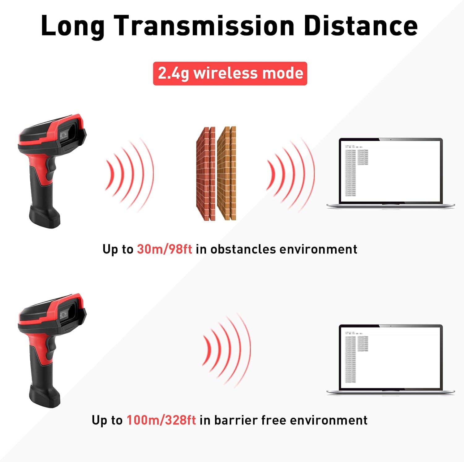 - 【Transmission Range】: In the 2.4G wireless mode of the bar code scanners readers, directly connect the 2.4G wireless receiver to a device with a USB interface. The transmission range can reach 100 meters/328 feet in an accessible environment, and 30 meters/98 feet in an obstructed environment.