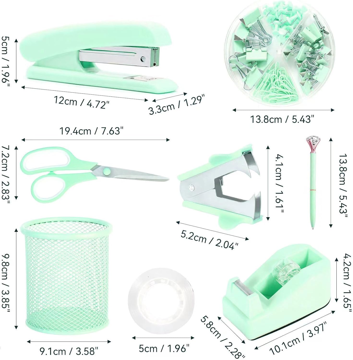 - List of Office Supplies Set:1*stapler, 1*staple remover, 1000*staples, 1*tape holder, 1*pen holder, 1*pens, 1*scissors, 1*Clear Tape and 1 box of binder clips; The size of desk accessories:stapler: 4.7 *2 *1.3 inch, tape dispenser: 4*2.3 *1.65 inch, staple remover: 1.6*2 inch, scissor: 2.8*7.6 inch, pen: 5.4 inch, pen holder: 4 *3.5inch.Such a complete green desk accessories combination is enough to meet your school and office using needs.