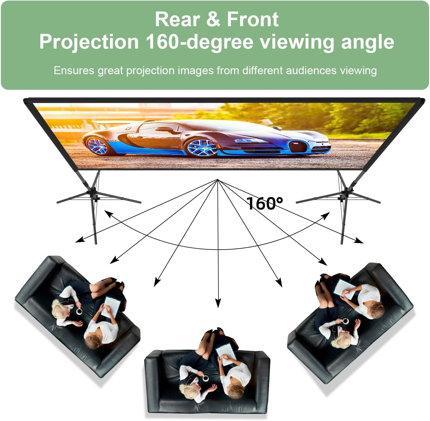 - 【Wrinkle-Free Movie Screen】120 inch projector screen with stand,4K Ultra Full HD projection screen 16:9 format,160° Wide Viewing Angle,Unlike ordinary screens, it is made of thicker polyester milk silk material, ensuring enhanced durability. That offers sharp and high-resolution images,even support front and rear projection screen