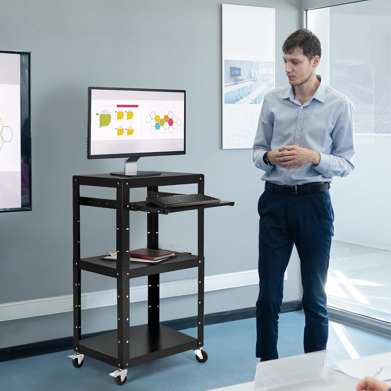- Long-range use: This business-grade AV cart is equipped with a built-in power strip with 3 outlets and 2 USB ports, a 16.4-ft power cord to charge devices over long distances.