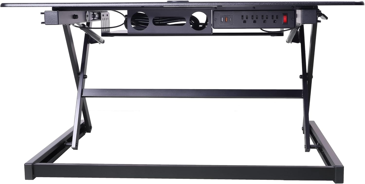 - Large worksurface - 40" by 23.5" desktop workstation can hold up to two 32" monitors, while 25.5" by 11.25" retractable keyboard tray can hold a laptop if needed and keep arms in ergonomic position to prevent strain while sitting or standing.