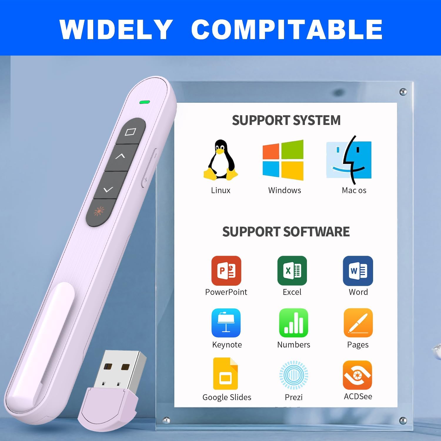 - ăWIDE COMPATIBILITYăThis computer clicker for presentations makes it easy to switch between different software and operating systems. Compatible with Mac OS, Windows. Supported software include Excel, Google Slides, ACDSee, PowerPoint, iWork, Prezi, etc