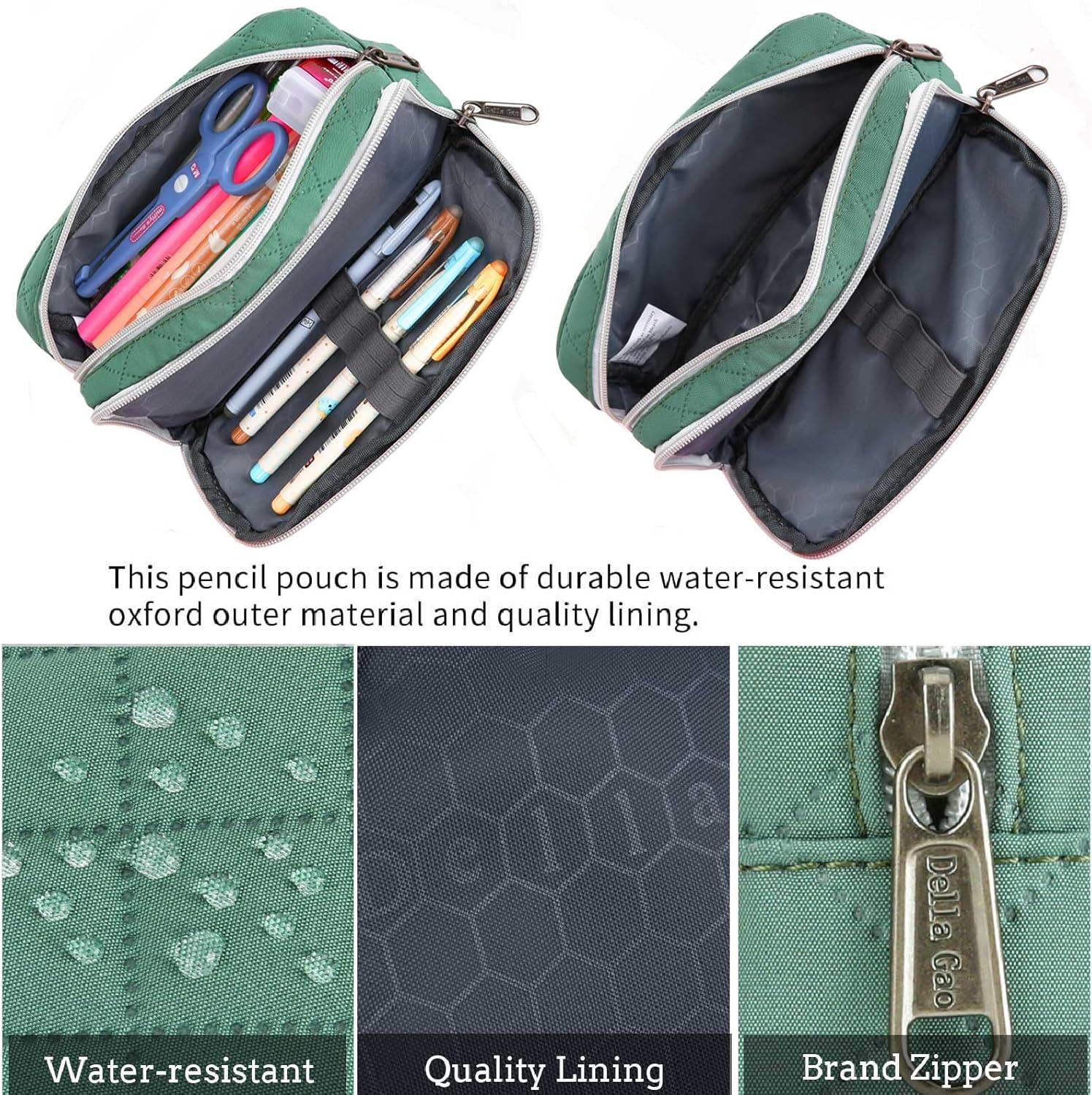 - Quality Material & Accessories:The dark green pencil case is made of hard-wearing lightweight polyester material, it's water-resisitant, tear-resisitant and washable.But you cannot put it in water, because the zipper are not waterproof.The brand metal zipper puller and smooth zipper provide longer service life. Attention:Case only, pencils not included