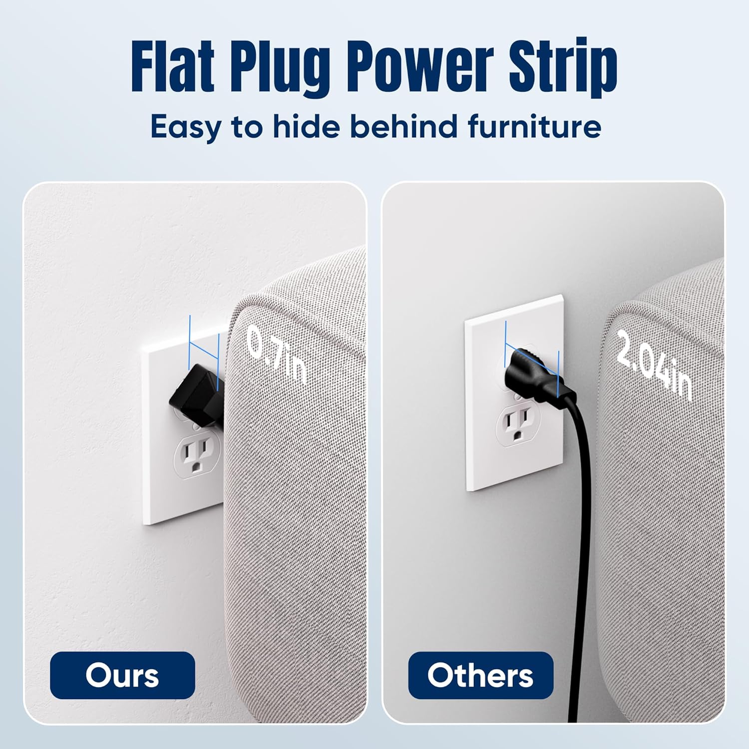 - đ ăSpace Saving Designă- Experience the ultimate in space efficiency with JouleLoom 6FT surge protector's slim flat plug, measuring a mere 0.7 inches thick. Unlike traditional plugs, its unique 45-degree right-angle design ensures it won't obstruct neighboring outlets. Plus, with two multi-directional hanging holes, you can easily mount it horizontally or vertically on workstations, walls, counters, bedrooms, optimizing your space like never before.