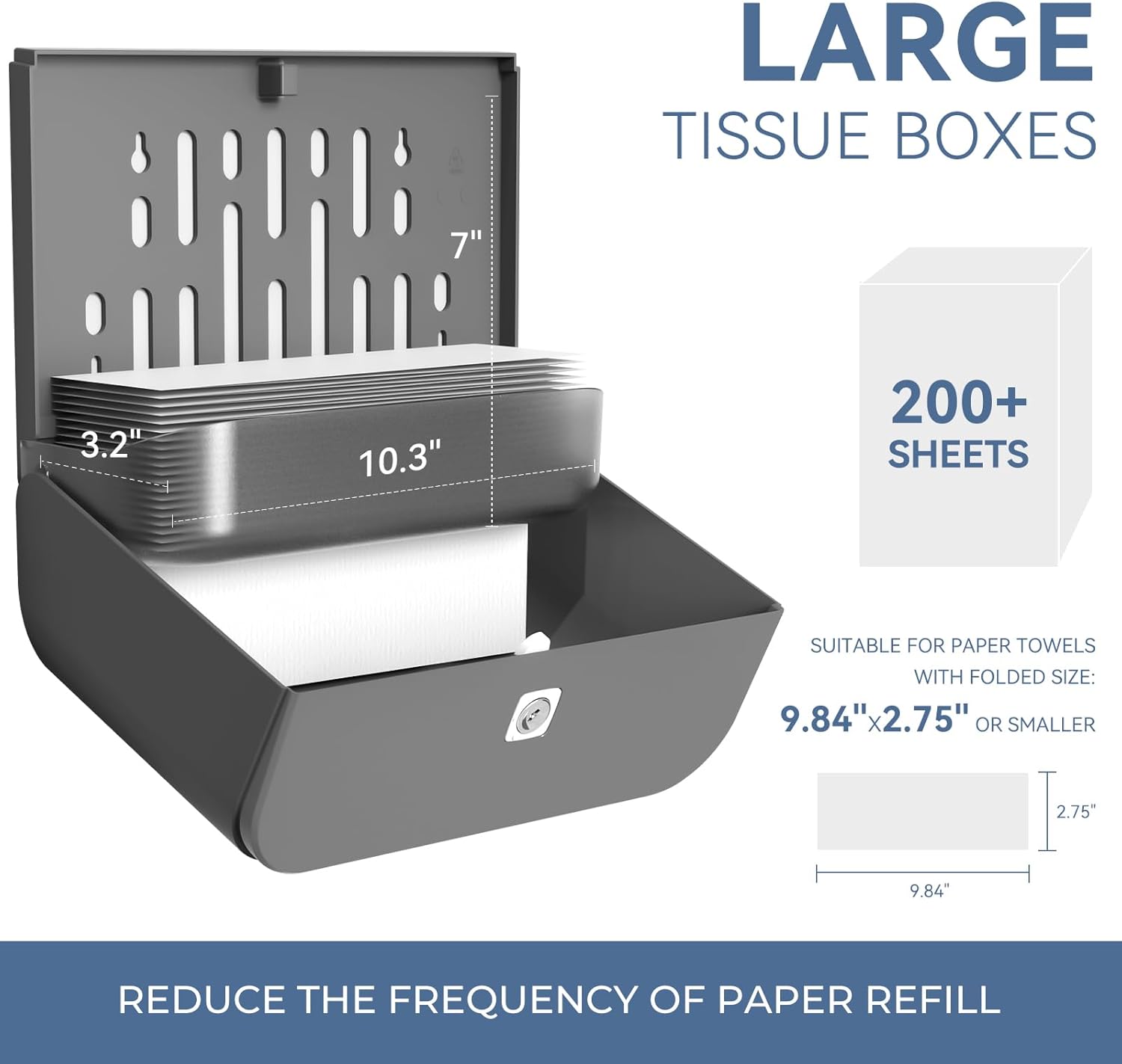 - 【Dimension】 Product Size: 10.7"L x 3.7"W x 8"H". Suitable towels size : C-Fold Multi-fold trifold paper towels with folded size within 10.2" L x 3.1"W.