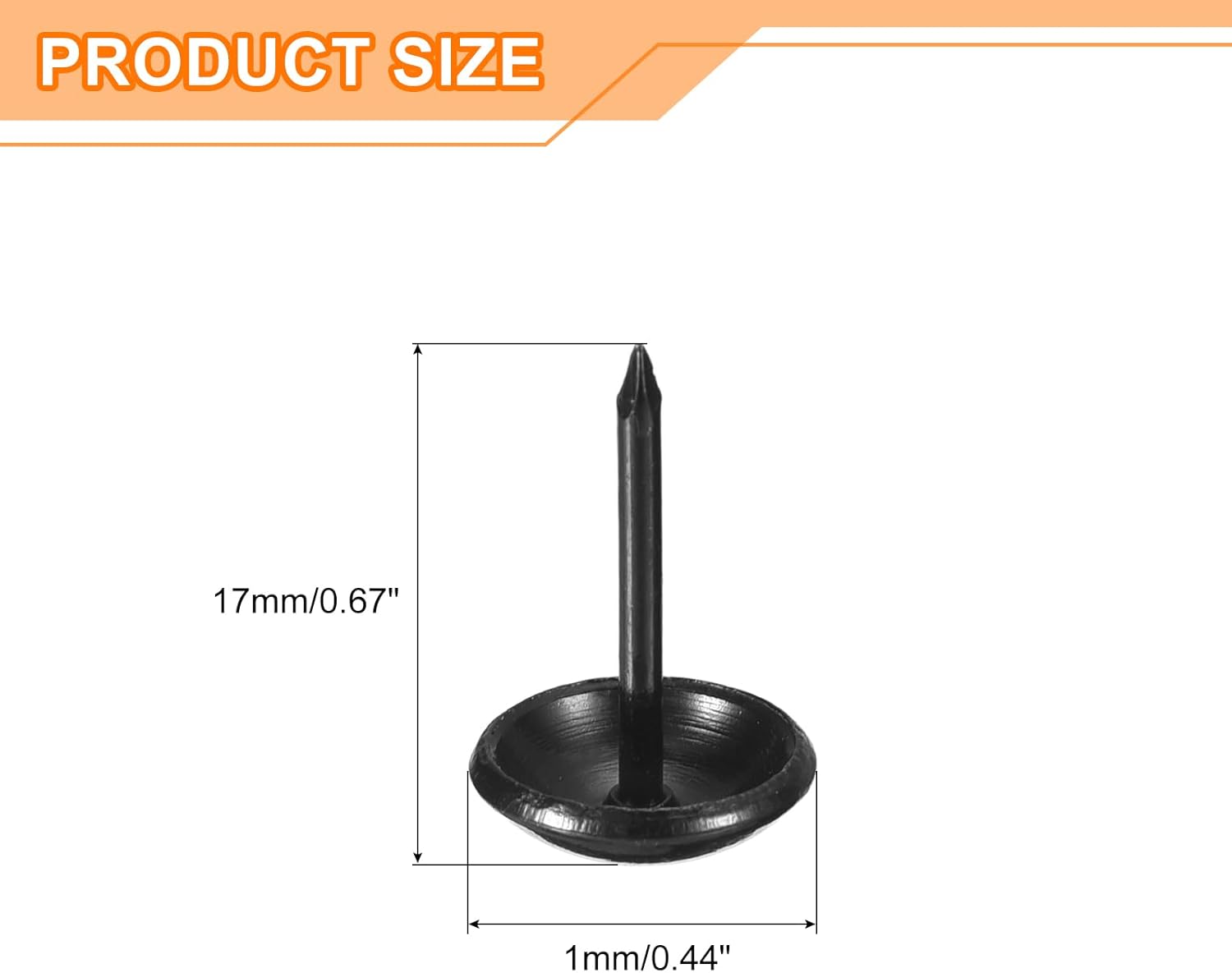 - Specifications: Material: Carbon steel; Color: Black; Diameter of nails head: 11mm/0.44inch; Shank length: 17mm/0.67inch; Package Content: 500Pcs x Upholstery Tacks Nail Pins