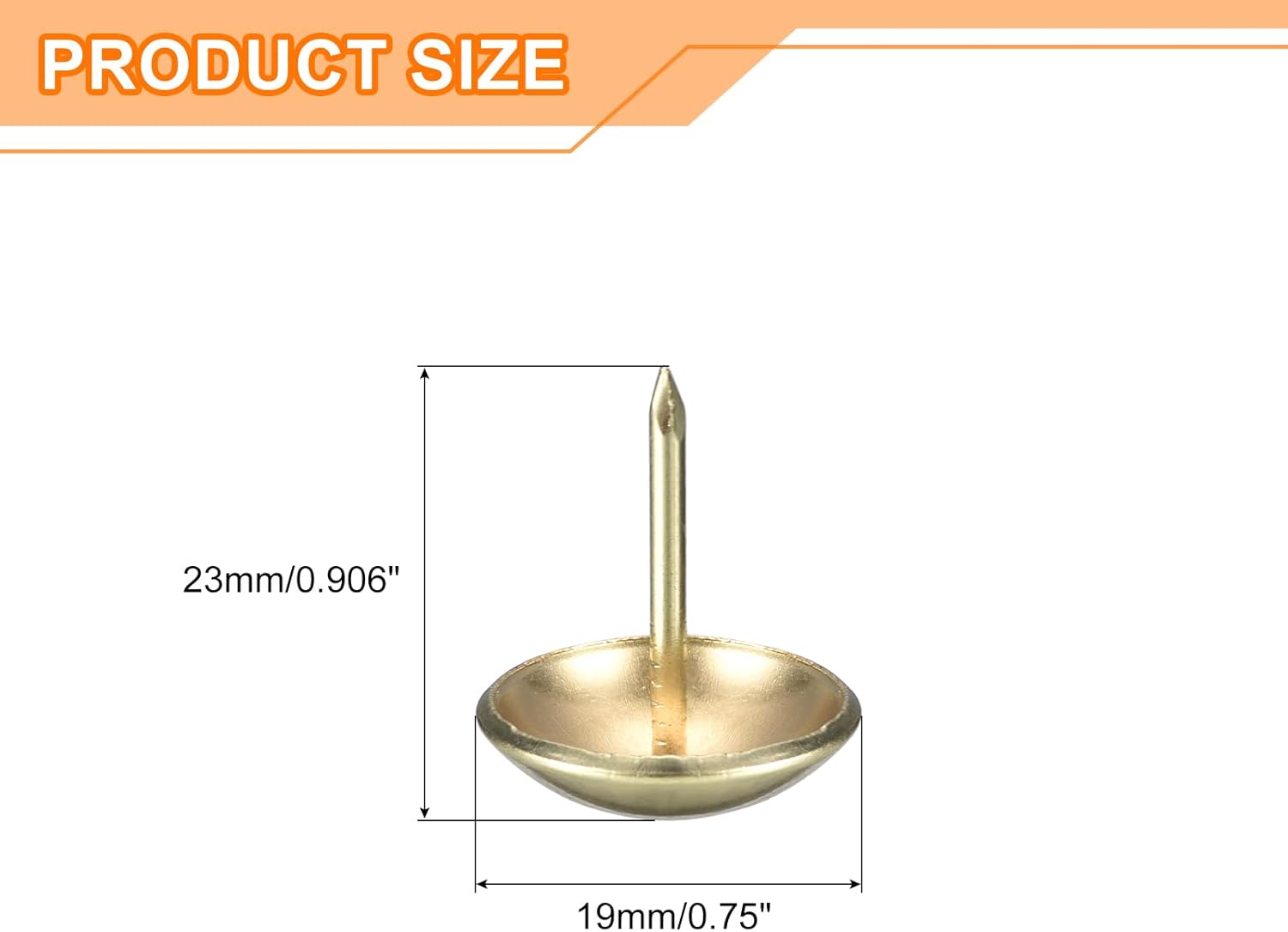 - Specifications: Material: Carbon steel; Color: Gold; Diameter of nails head: 19mm/0.75inch; Shank length: 23mm/0.906inch; Package Content: 50Pcs x Upholstery Tacks Nail Pins