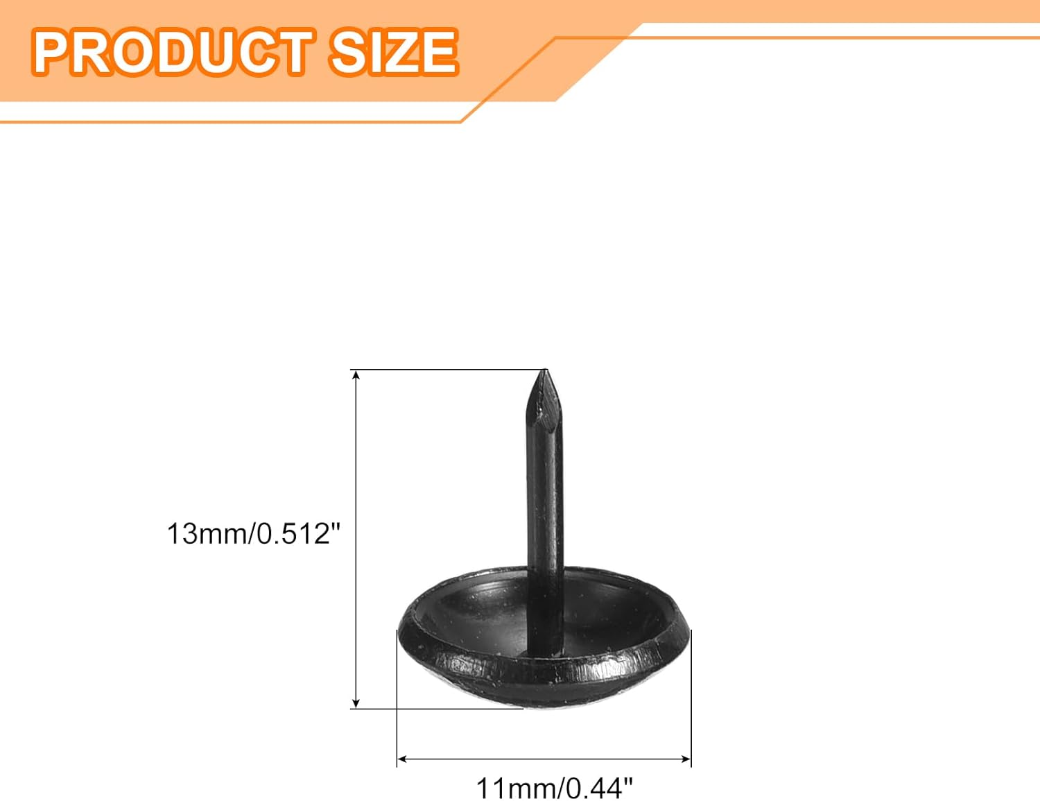 - Specifications: Material: Carbon steel; Color: Black; Diameter of nails head: 11mm/0.44inch; Shank length: 13mm/0.512inch; Package Content: 150Pcs x Upholstery Tacks Nail Pins