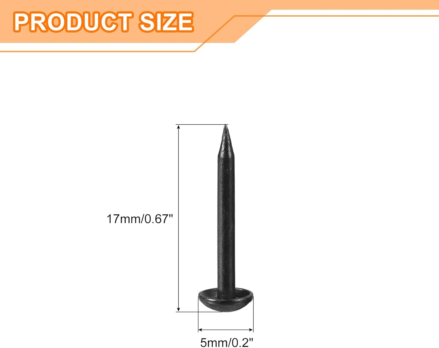 - Specifications: Material: Carbon steel; Color: Black; Diameter of nails head: 5mm/0.2inch; Shank length: 17mm/0.67inch; Package Content: 50Pcs x Upholstery Tacks Nail Pins