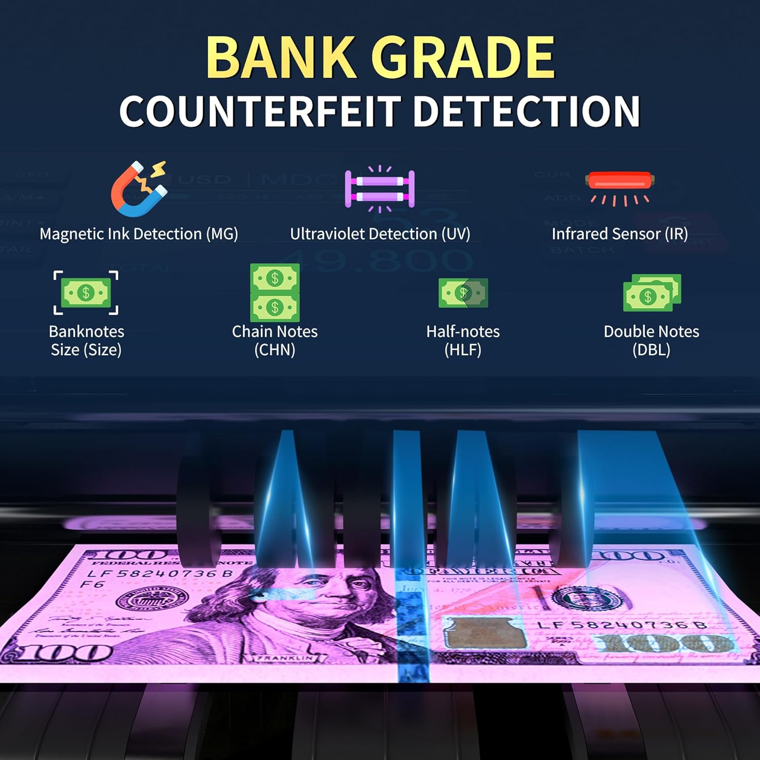 - Efficient & Accurate Counterfeit Detection: Bank-grade N70 money counter with 2 special infrared detection tubes, UV detection, magnetic detection and dimensional detection, provides the most accurate detection results to completely protect your company from counterfeit money. If counterfeit or half, chain, and double bills are detected, the screen will display red and an alarm will sound.