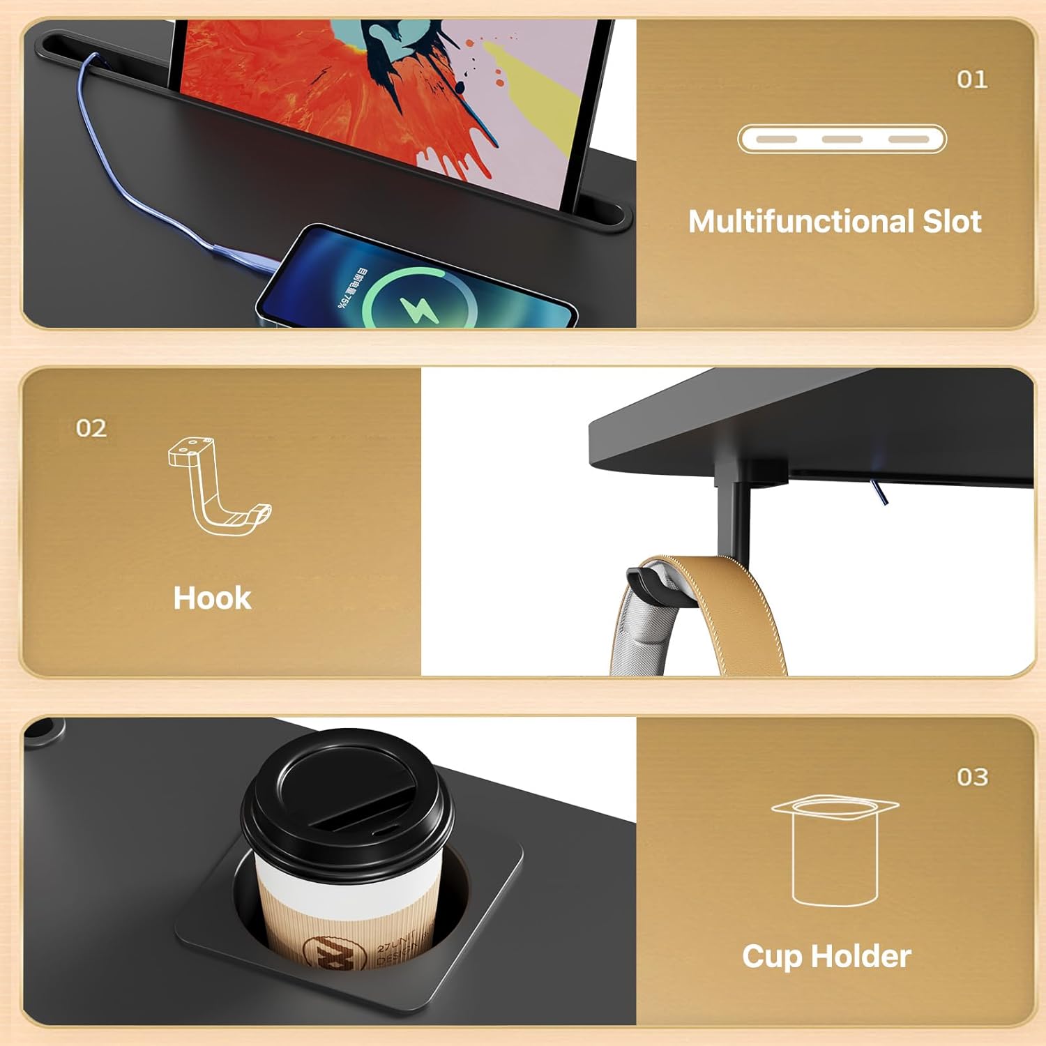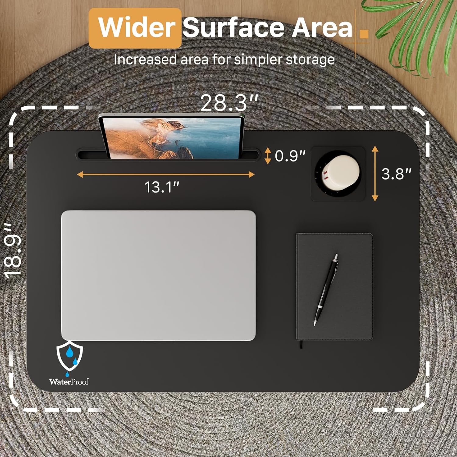 - Multipurpose Mobile Laptop Desk: 28.3''x19'' rolling desk is equipped with cup holder and dedicated slots, it's a good way to contain your drink and office supplies. Meanwhile, Hook design makes it convenient to organize your headset or backpack.