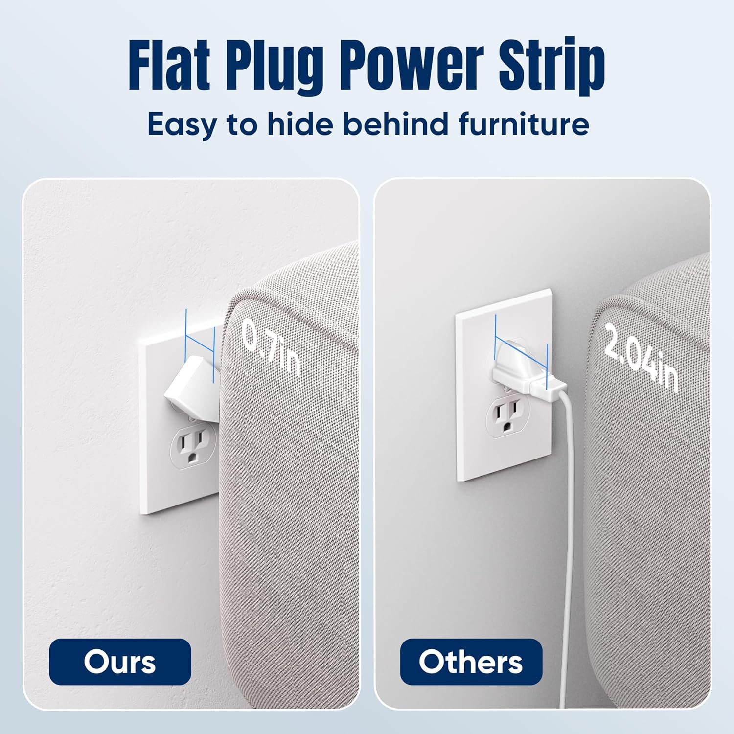- đ ăSpace Saving Designă- Experience the ultimate in space efficiency with JouleLoom 10FT surge protector's slim flat plug, measuring a mere 0.7 inches thick. Unlike traditional plugs, its unique 45-degree right-angle design ensures it won't obstruct neighboring outlets. Plus, with two multi-directional hanging holes, you can easily mount it horizontally or vertically on workstations, walls, counters, bedrooms, optimizing your space like never before.