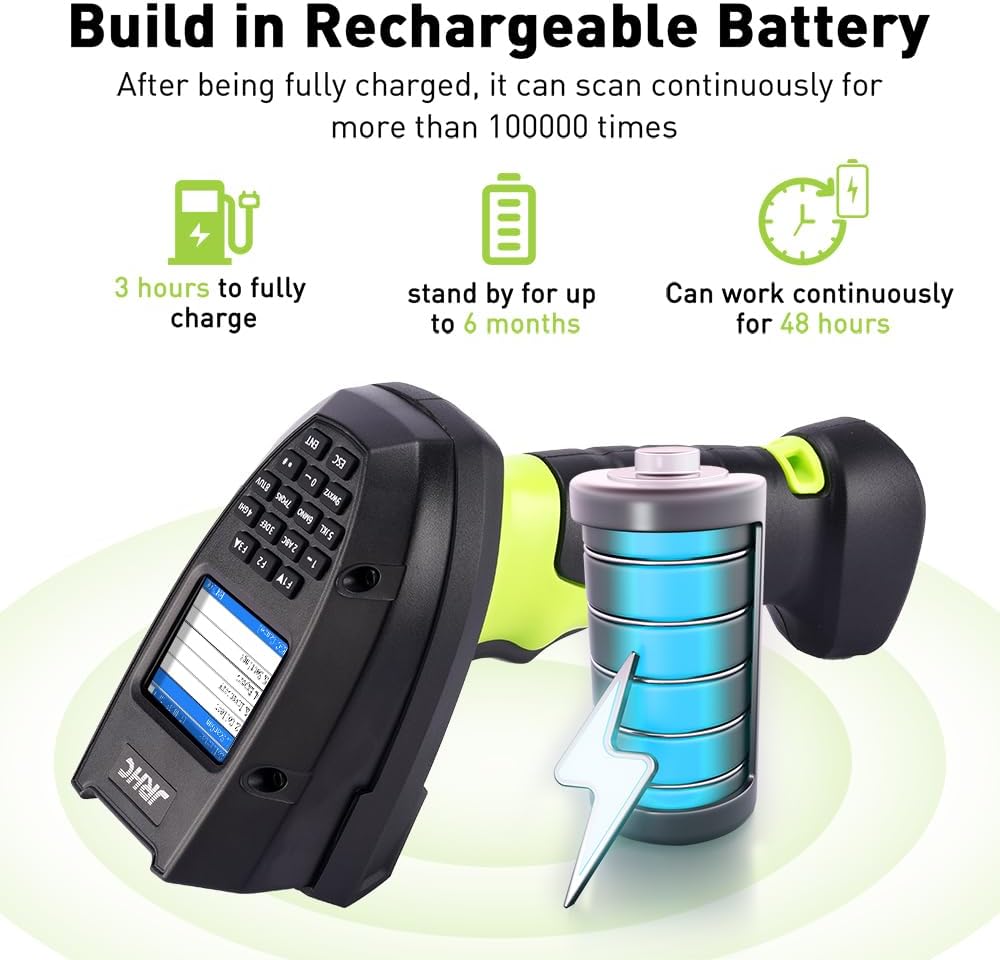 - 【2000mAh Battery & 16M Storage Space】: Built in 2000mAh large capacity battery, can be used for at least 20-40 hours, and can scan continuously for more than 100000 times. It can be charged by connecting to a data cable via Wireless Dongle Built In Stand, and can be fully charged in approximately two hours.The built-in 16M storage space can store 100000 barcodes.