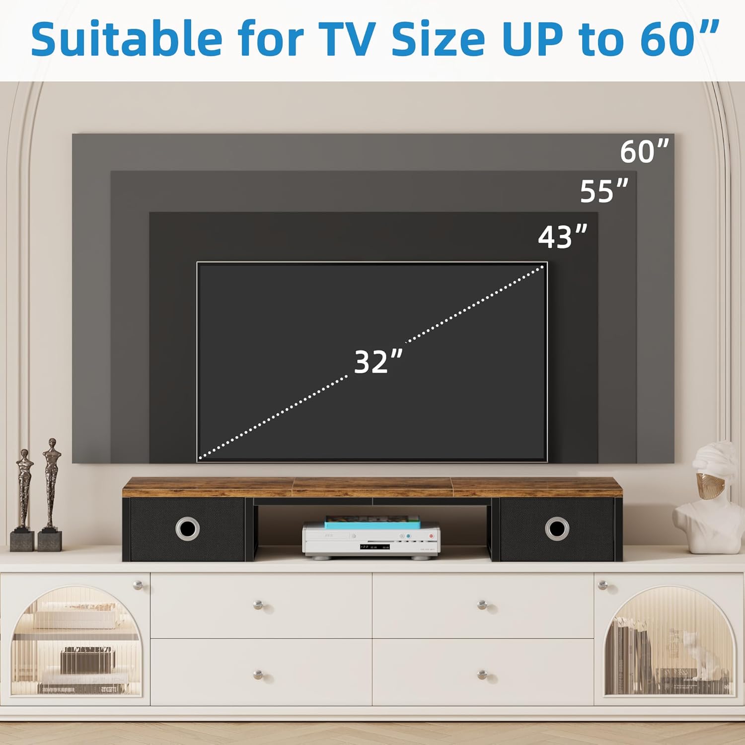 - ăTV Riser StandăDimensions: 45"LĂ11.8"WĂ6.5"H. Large TV riser stand can fit your 32 42 43 45 50 55 60 inch tvs, monitor stands for 2 monitors(up to 32"). Raise your tv and offer extra storage space for your items. Ideal for your living room,bedroom,office.