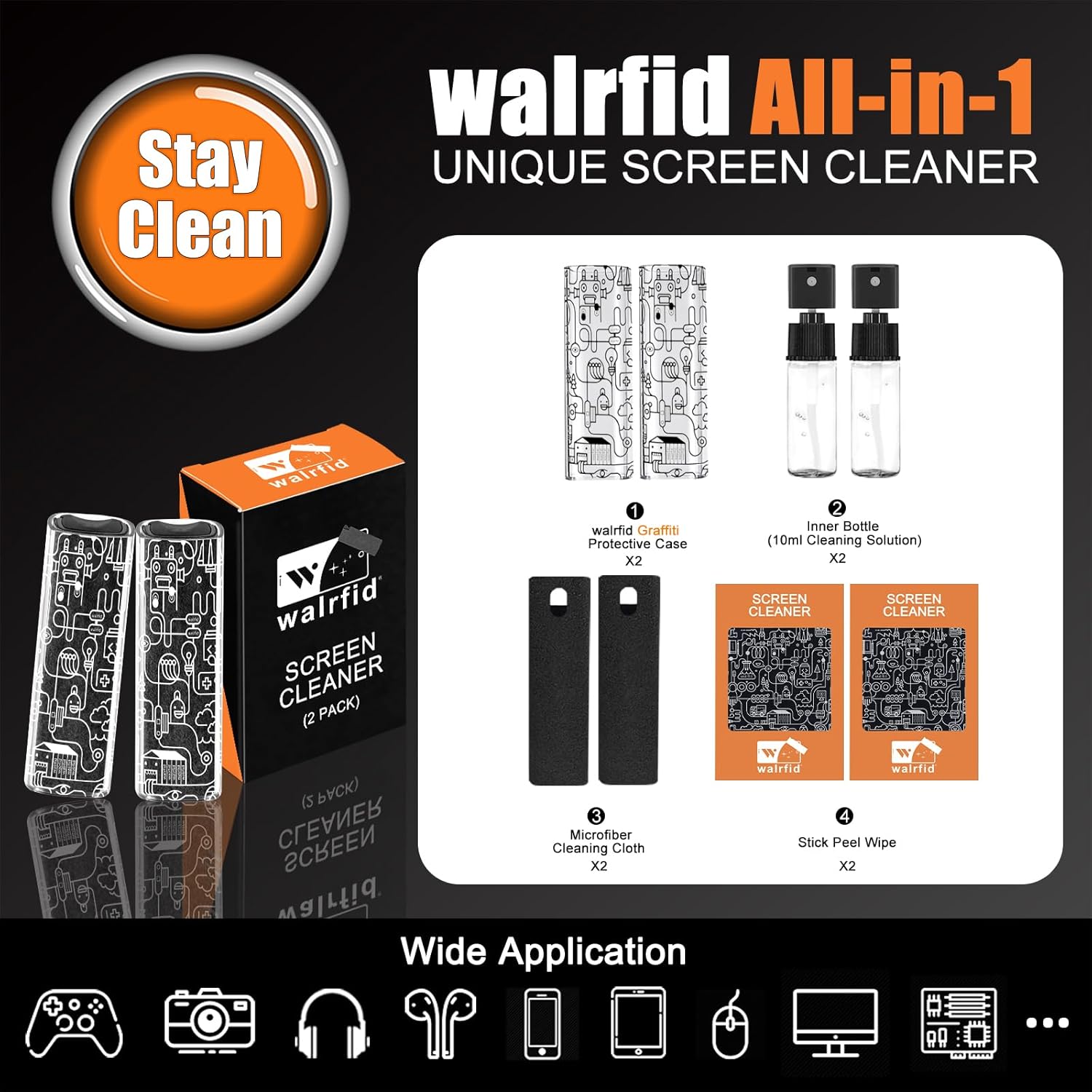 - 2 in 1 Screen Cleaner Kit: All-in-One screen cleaner spray and wipe tool, including 2 Pack 10ml built-in screen cleaner spray, square phone cleaner sticker, microfiber cleaning cloth, graffiti protective case, and storage box. walrfid graffiti macbook cleaning kit effectively removes smudges, fingerprints, dust, and dirt, ensuring that your electronic screen remains clear for optimal visibility without scratching.