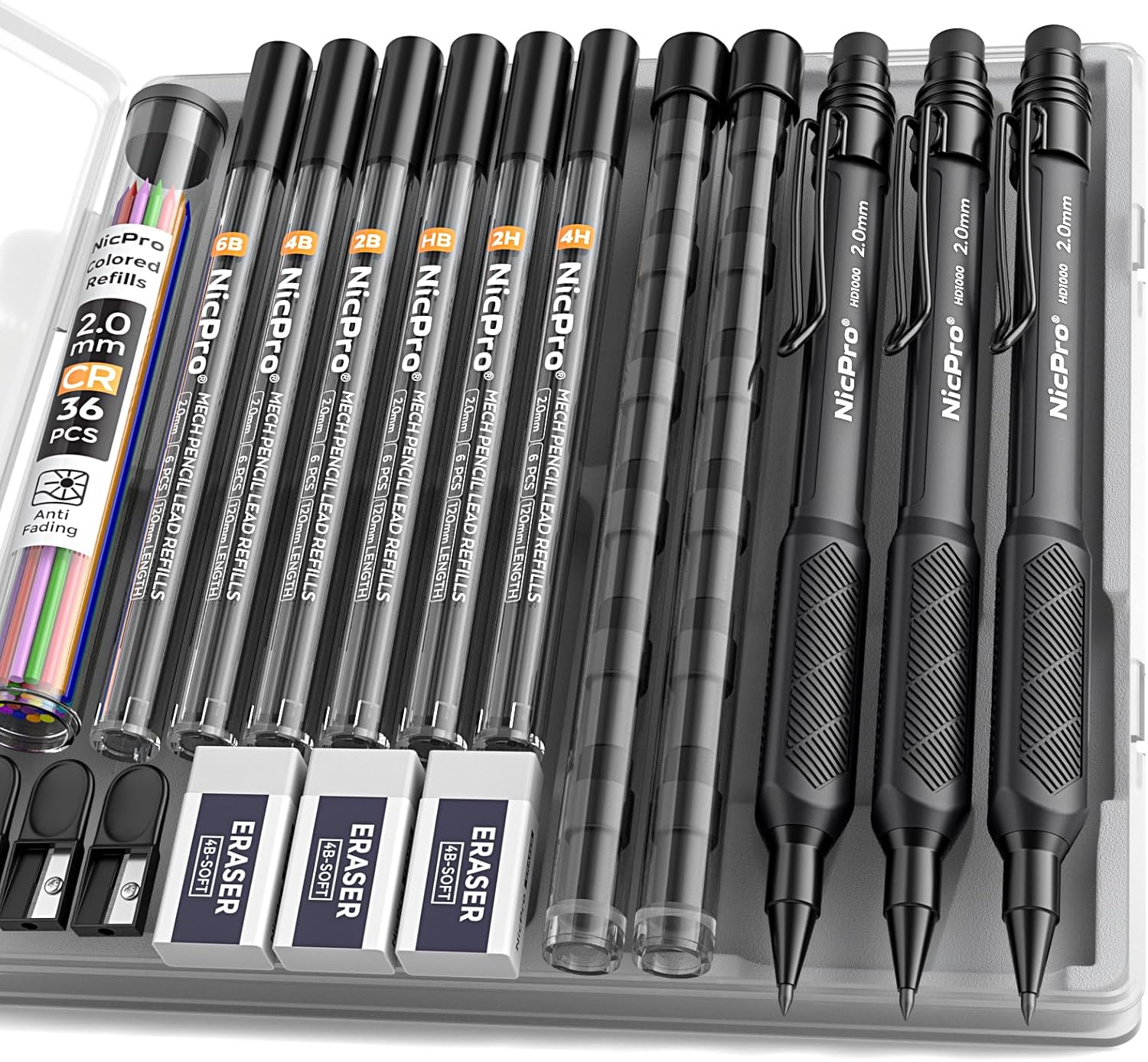 - Comprehensive Stationery Set: Nicpro mechanical pencil kit includes 3 pcs mechanical pencils 2.0, 72 pcs 2mm lead refills(4H, 2H, HB, 2B, 4B, 6B black and color), 1 tube of 6 replacement cap eraser refills, 3 pcs erasers and 3 pcs sharpeners. It offers everything you need for various writing and drawing tasks, making it a one-stop solution for all your stationary needs