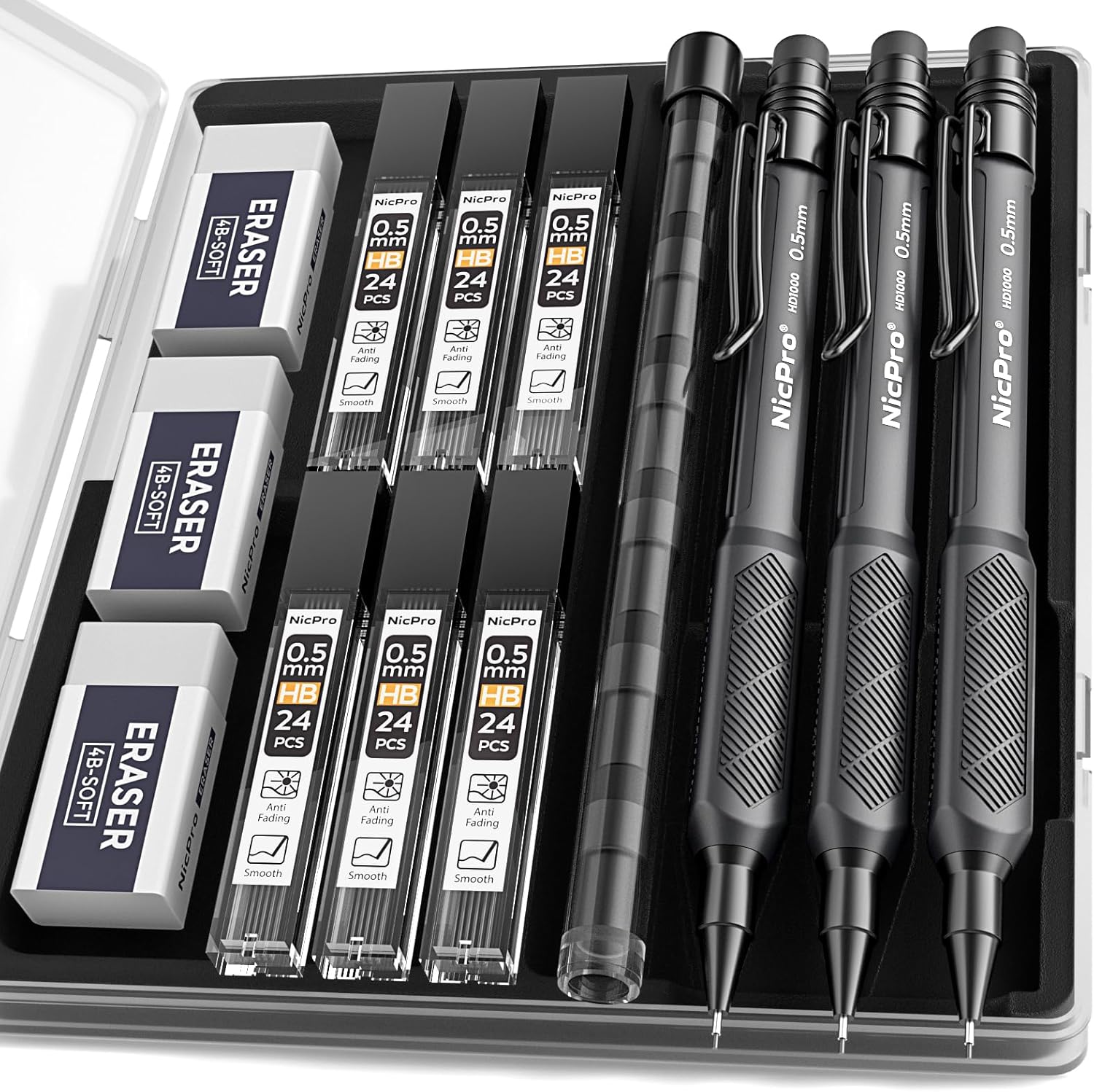 - All - in - One Stationery Kit: Nicpro mechanical pencil set comes with 3 pcs 0.5 mechanical pencils, 6 tubes of HB 0.5 lead refills (144 total), 1 tube of 6 replacement cap eraser refills, and 3 pcs 4B eraser. Ready to use right out of the box—your essential writing pencils