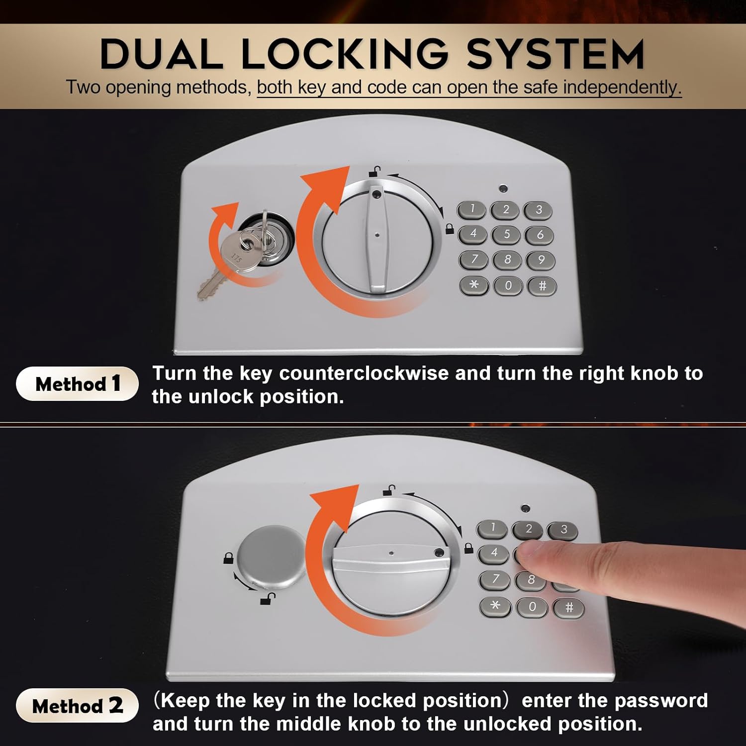 - 【HIGH SECURITY】The electronic lock is equipped with a keypad for easy access and includes 2 backup keys in case of power outages. Protect your valuables with a fire-resistant digital code lock safe. Your assets will be safe from fire and theft.(ATTENTION:Need to prepare four AA batteries by yourself)