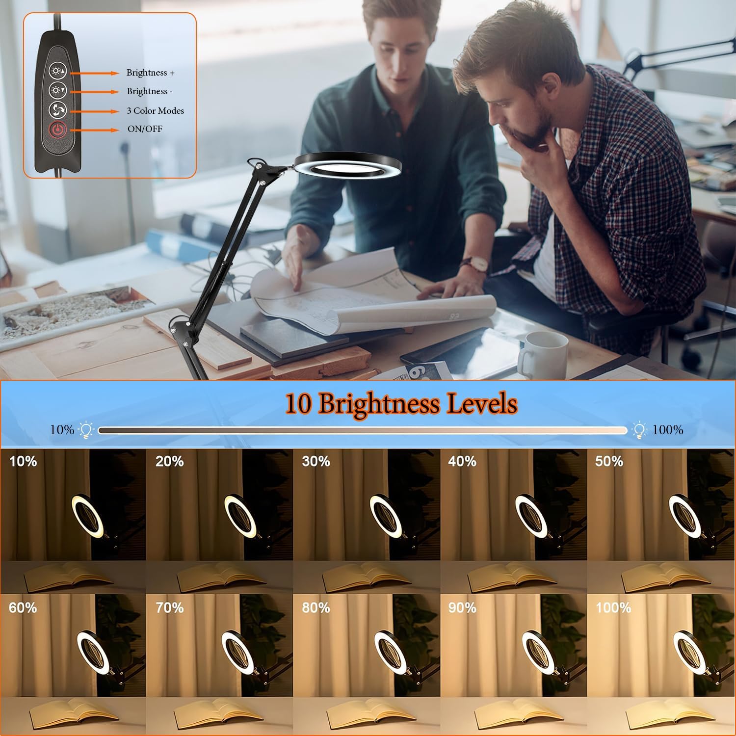 - 【Customizable Lighting with 3 Color Modes】The magnifying lamp includes three color options: cold white light, warm light, and a mix of white and warm light. With 10 adjustable brightness levels (10% to 100%), you can select the ideal light for any environment or task, whether you’re working on puzzles, painting, embroidery, or manicures.