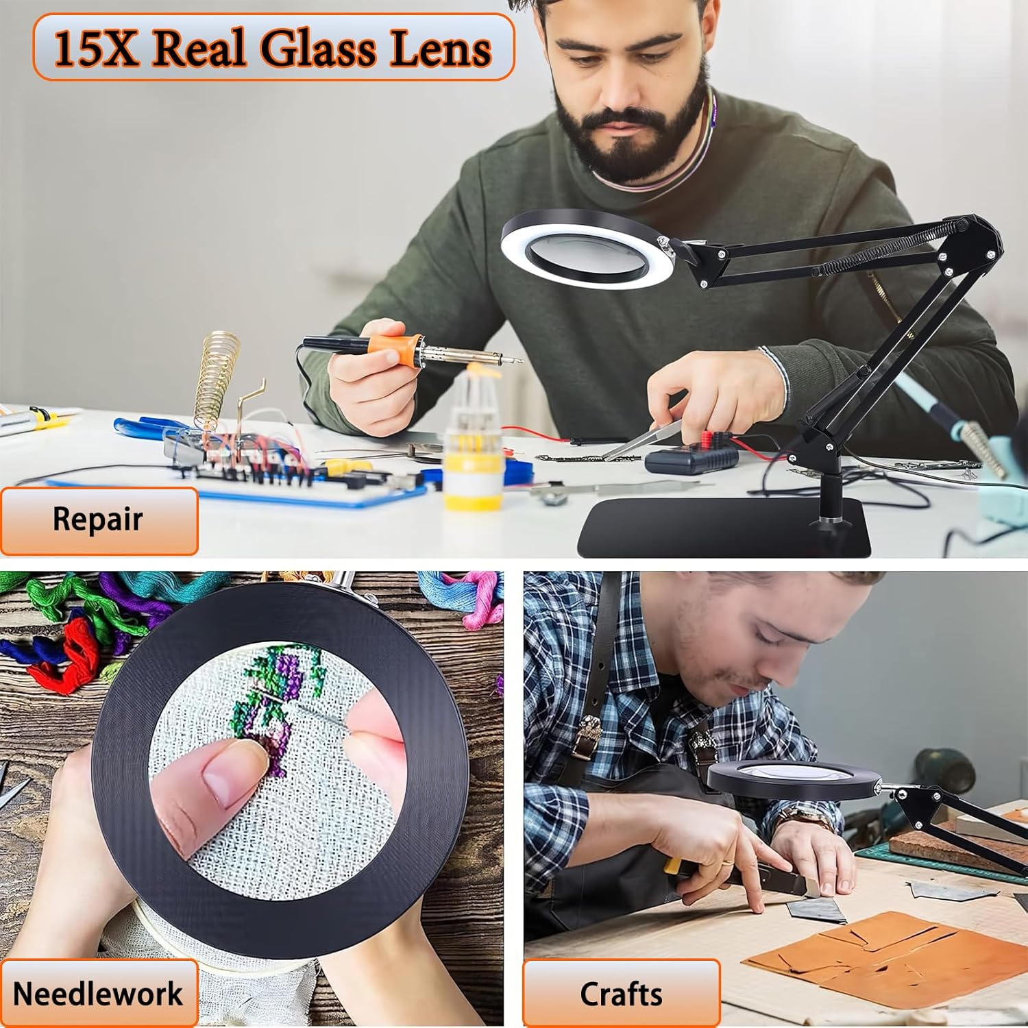 - 【360° Adjustable, Flexible Arms】The lamp features two aluminum rotating arms that extend freely and can be rotated 360 degrees, allowing you to position the lens at the perfect angle for any task. Enjoy hands-free convenience as the lens moves smoothly to your desired working position, providing optimal light coverage.