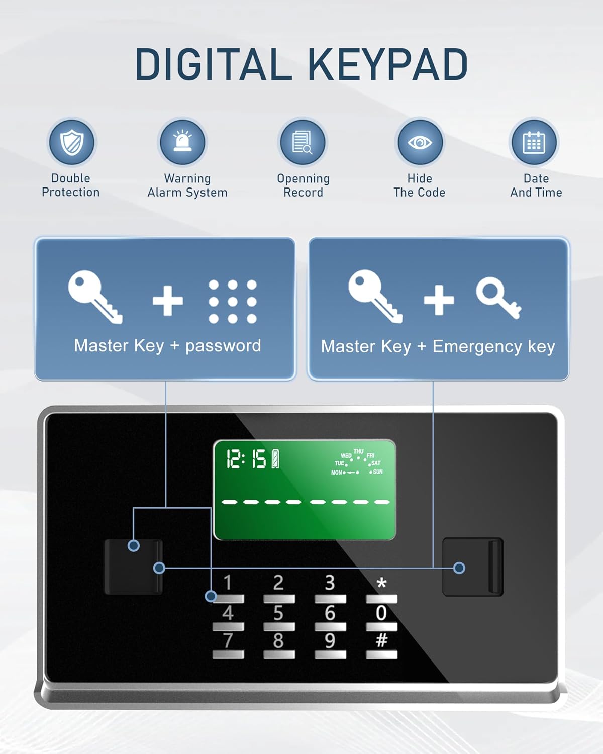- ใAnti-Theft Alarm System & Hidden Codeใ: Our large home safe has anti-theft alarm systems.Violent vibration or Three- incorrect entries can activate the alarm system by sounding for 60 seconds. Security Safe can keep max 35 opening records and allows you to program your code with 1-8 digits; Dial โ*โ before entering the code can active the secure display feature (the code you enter will not be shown on the screen)