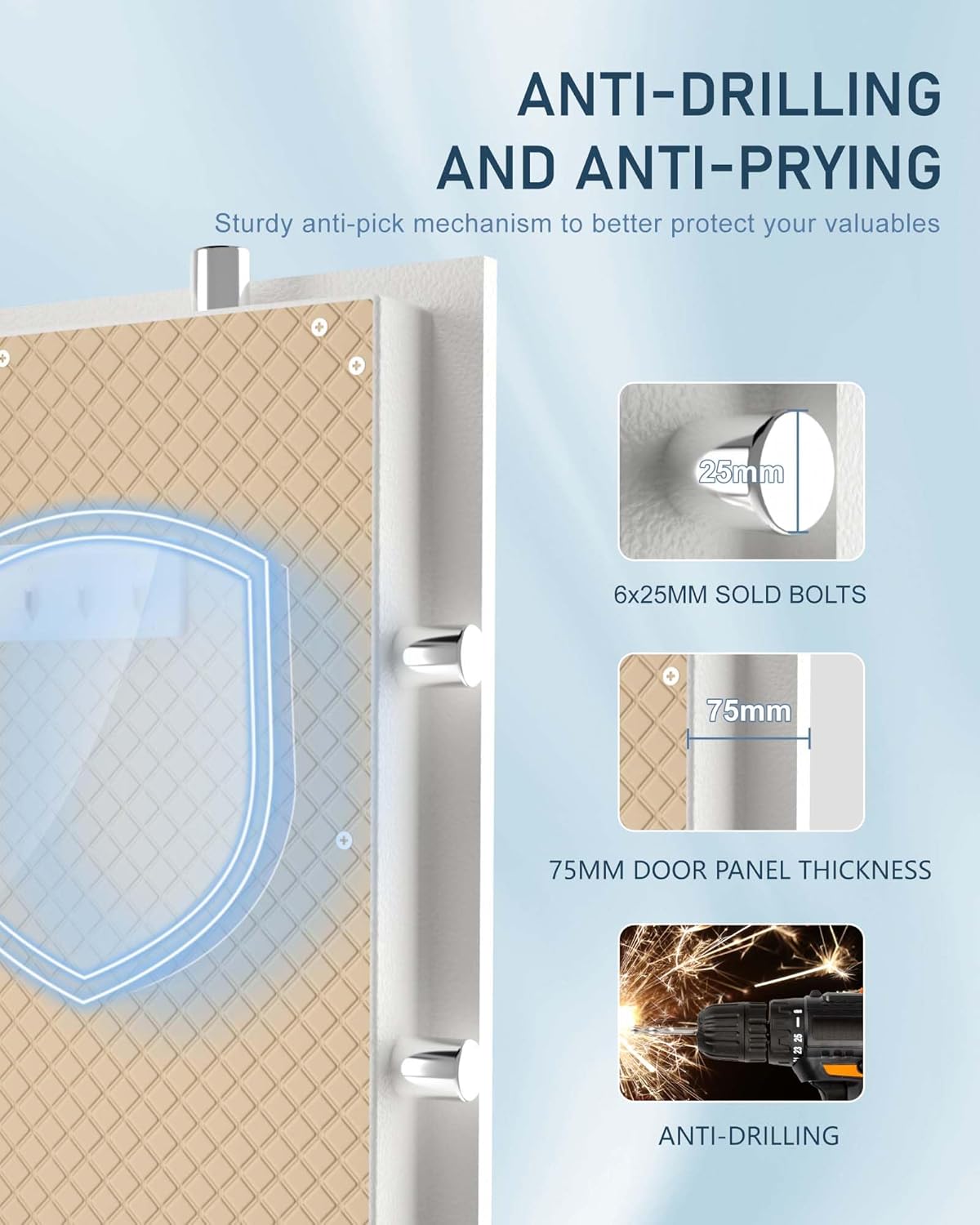 - ใExtra Large Security Safe Boxใ๏ผOur extra-large security safe weighs 108 pounds, so it's hard for anyone to steal it. It features a 75mm extra-thick explosion-proof steel door, 6*25mm high-strength solid locking bolts and pry-resistant concealed hinges, guaranteeing top-notch security for your valuables. For added protection, the safe can be anchored to the wall using expansion screws.