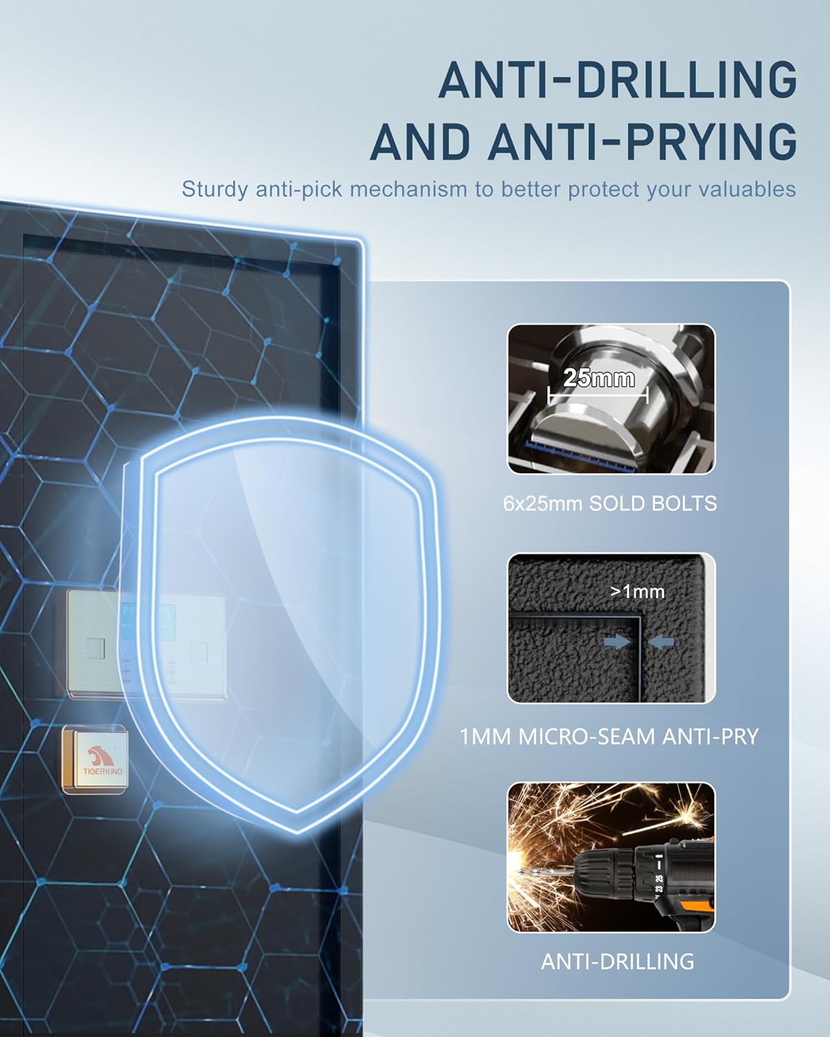 - ใEnhanced Dual Key Securityใ๏ผTigerking safe has a dual safety key unlocking function, dual key unlocking increases security. Two methods are available for unlocking: 1. Dual key unlocking; 2. Master key + password unlocking, NOTE: The master key is always needed to open the safe, with this design, even if someone gets your code, without the master key, they still can not access the safe.