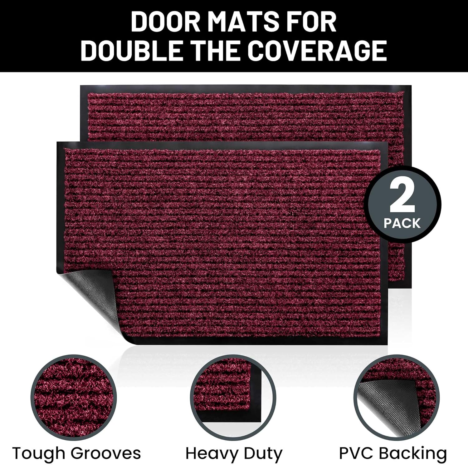 - Includes 2 Larger RED Indoor Outdoor Floor Mats: Enjoy two amazing heavy duty high quality ribbed polyester door mats (Larger 36" x 24") that will be perfect welcome for the everyday home. Amazing value 2-Pack.