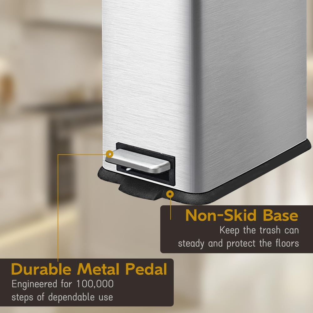 - Stable & Anti-Slip: Non-skid base keep your trash can firmly grounded, no matter the floor. And the strong steel pedal is engineered to last over 100,000 steps.