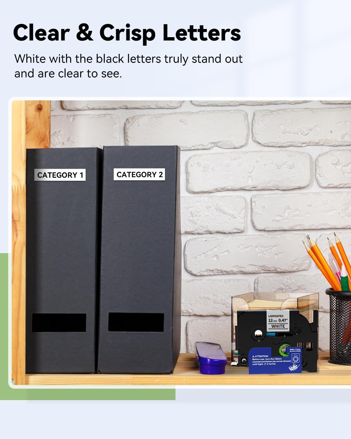 - Versatile Labeling: White label tape are an effective option for use on smooth and textured surfaces. Ideal for organizing cables, files, shelves, and more with crisp black text on white label tape
