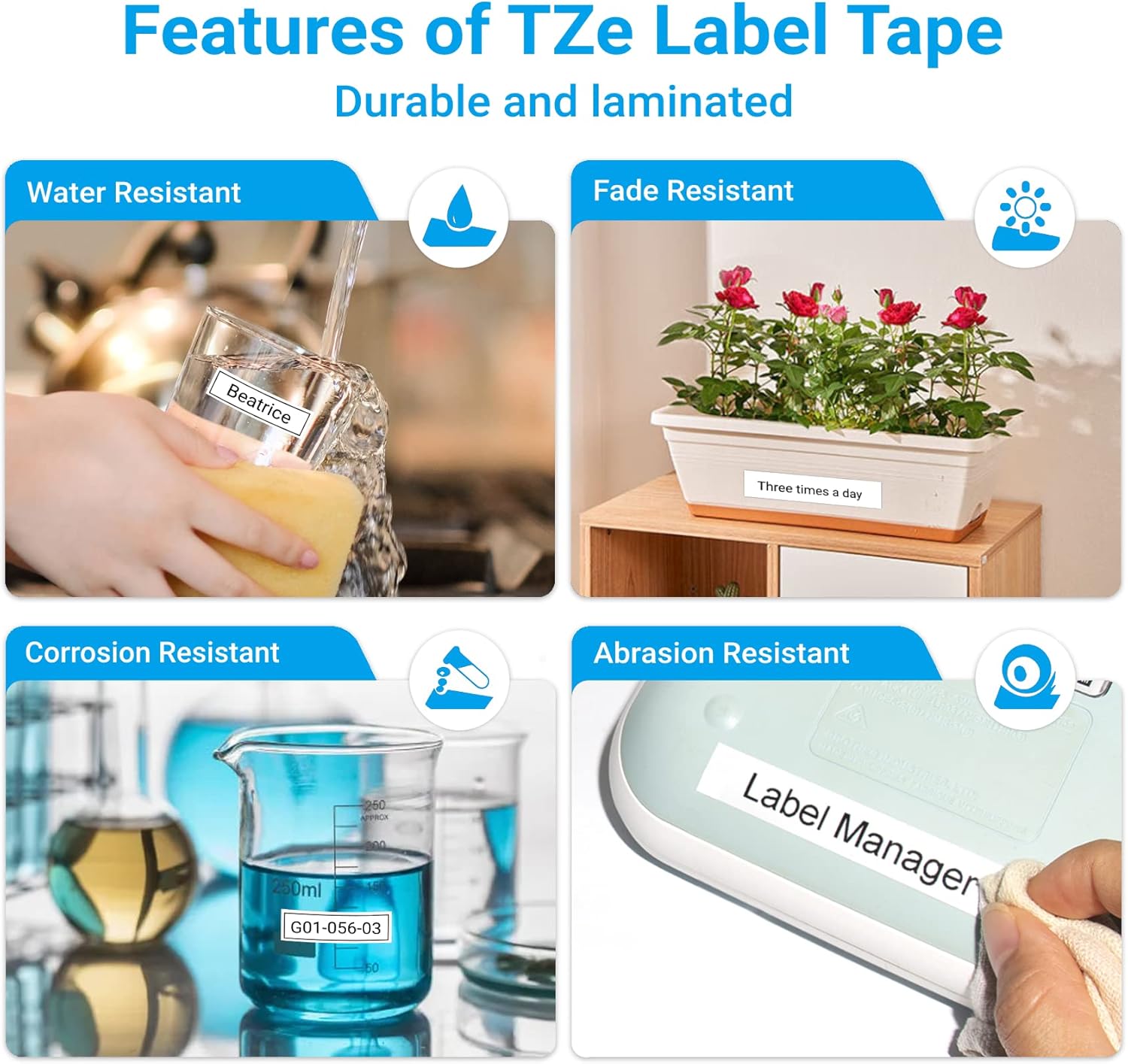 - (3) Tze-231 Tape Laminated : TZ-231/TZe-231 TZ tape 12mm 0.47 laminated white is long lasting and resist to water, oil, abrasion, temperature and fade. Enduring, practical and printed clearly.