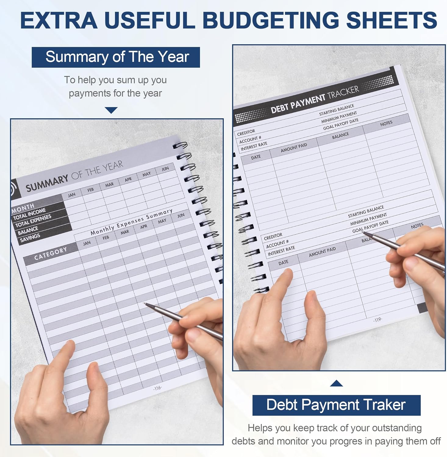 - ✅ Extra Financial Tools – Features bank account tracking, yearly financial summaries, debt payoff planning, and note-taking sections for better money management.