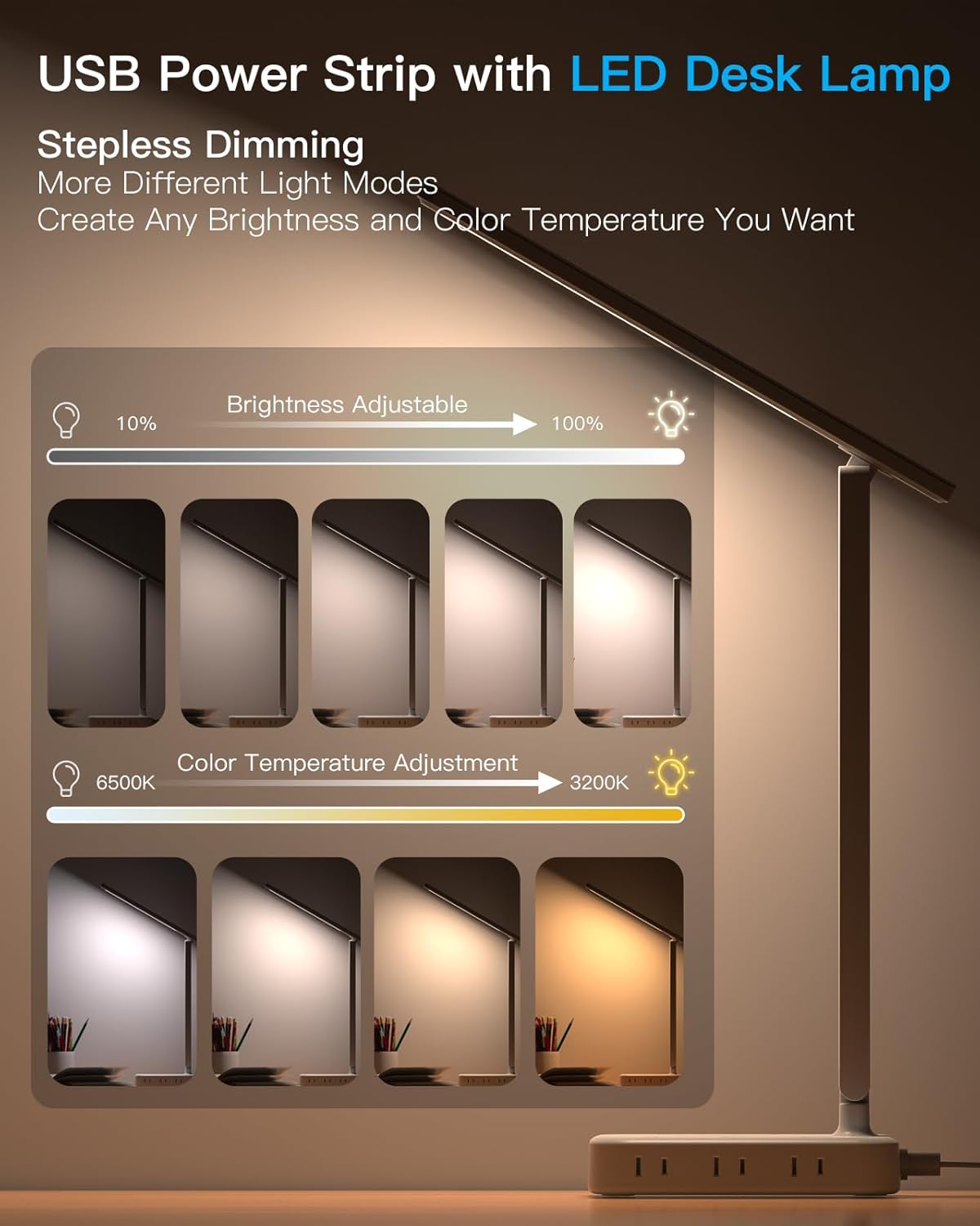 - 【 Multi-Functional Deskop Essentials 】 This usb c power strip with 45° low profile right angled flat plug and 5 ft extension cord, you can carry it anywhere. It not only a table lamp, but also a multi-function desktop power strip wtih usb charging station.You can easily choose a variety of lights for painting, reading, writing, crafts, nail charms, kindle reading lighting needs. easily adjust the brightness by touch. Cool white lighting great suit for working, studying, reading.