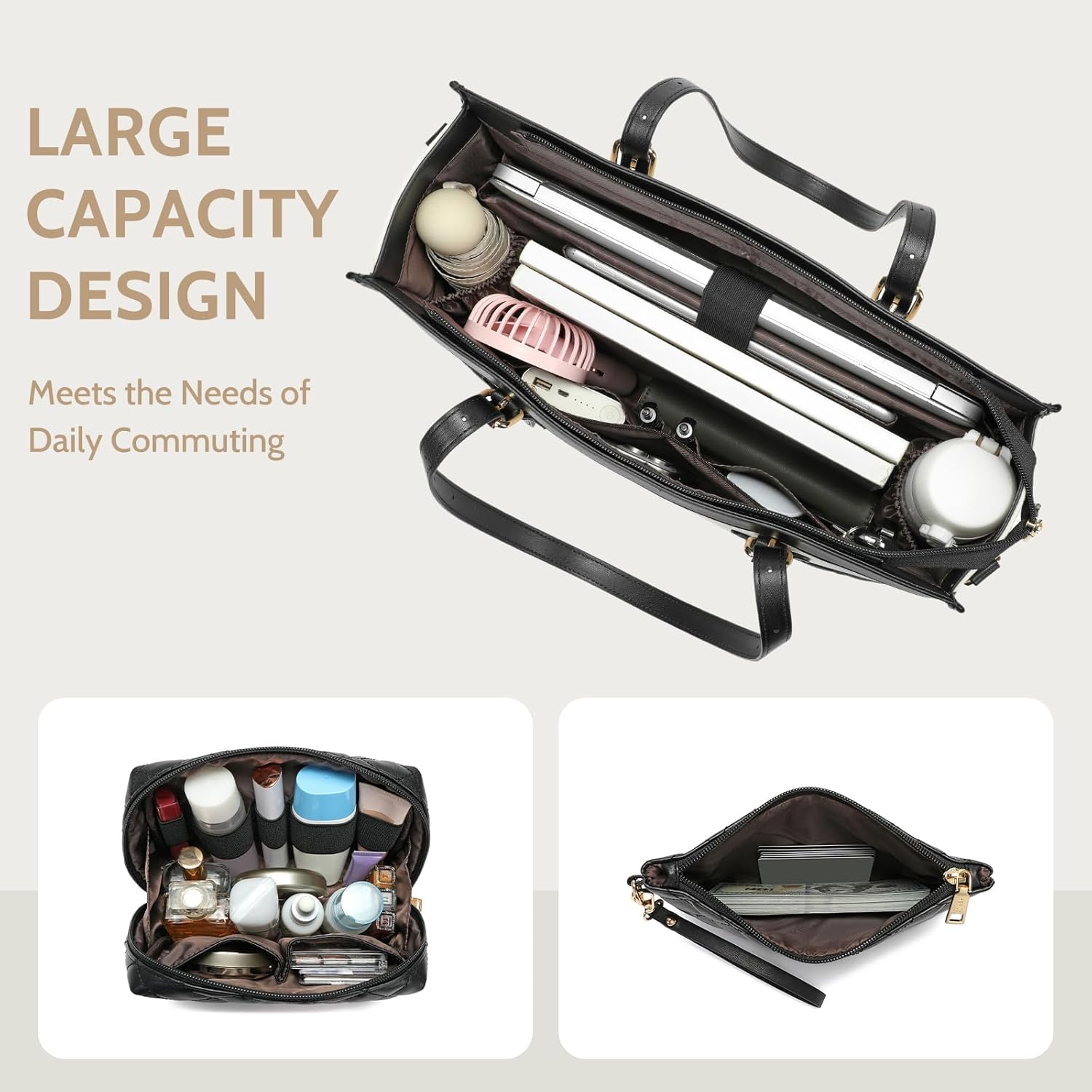 - 【Large Capacity Laptop Bag】:Size of womens laptop bag:16"L x 11.5”H x 5.8”D.Also includes 1 x makeup bag and 1 x clutch purse is compact enough to fit in your phone, wallet, makeup, passport, etc.The dedicated laptop compartment provides maximum protection for your Computer.