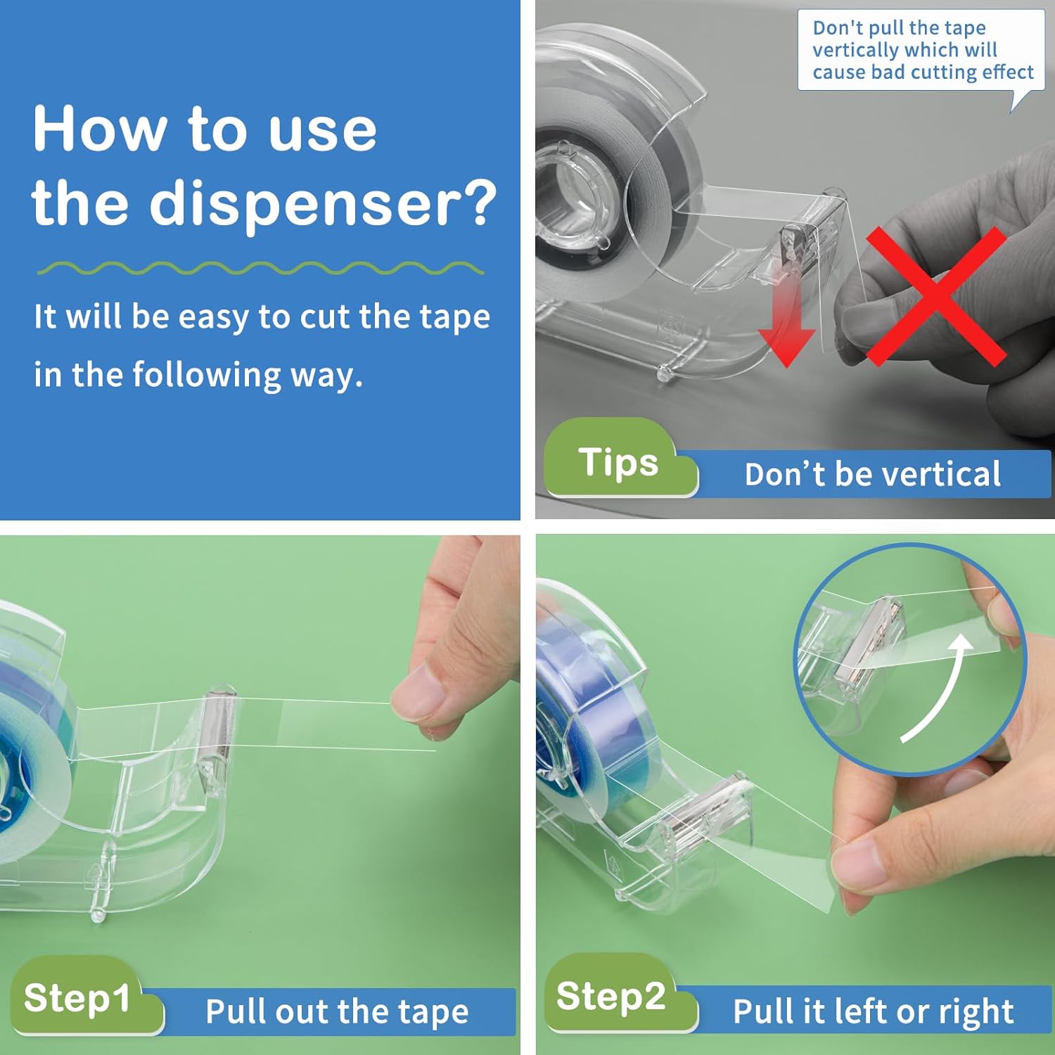 - Transparent Dispenser: Features a long-lasting shape cutting blade and a solid shell that resists damage and corrosion. Allows for quick and easy application of tape