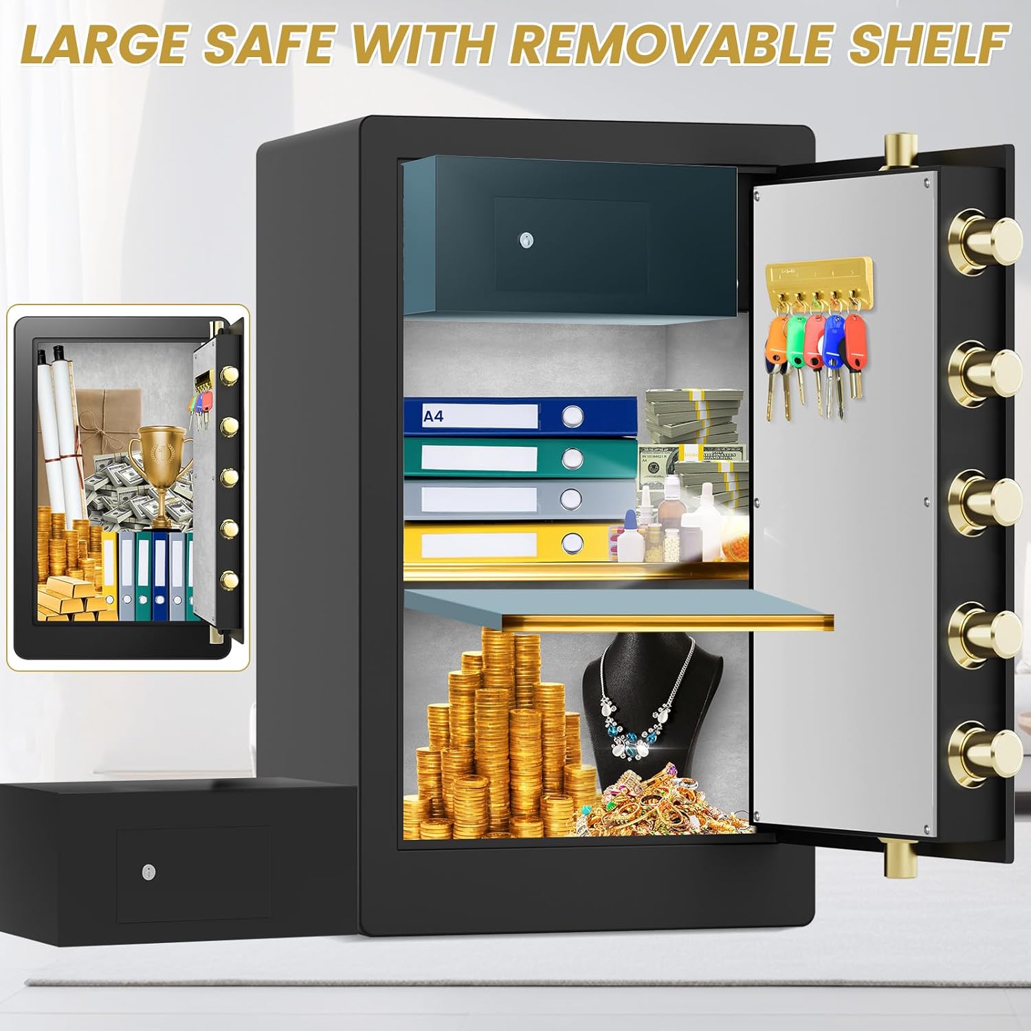 - REMOVABLE BUILT IN LOCK BOX AND SHELF: The large capacity safe can meet the daily storage needs of you and your family. The interior has removable inner cabinet and shelf that can easily adjust storage spaces of different sizes according to your needs, making it easy to classify and store your valuables. Included waterproof and fireproof document bag for storing cash, passport, jewelry and important documents etc