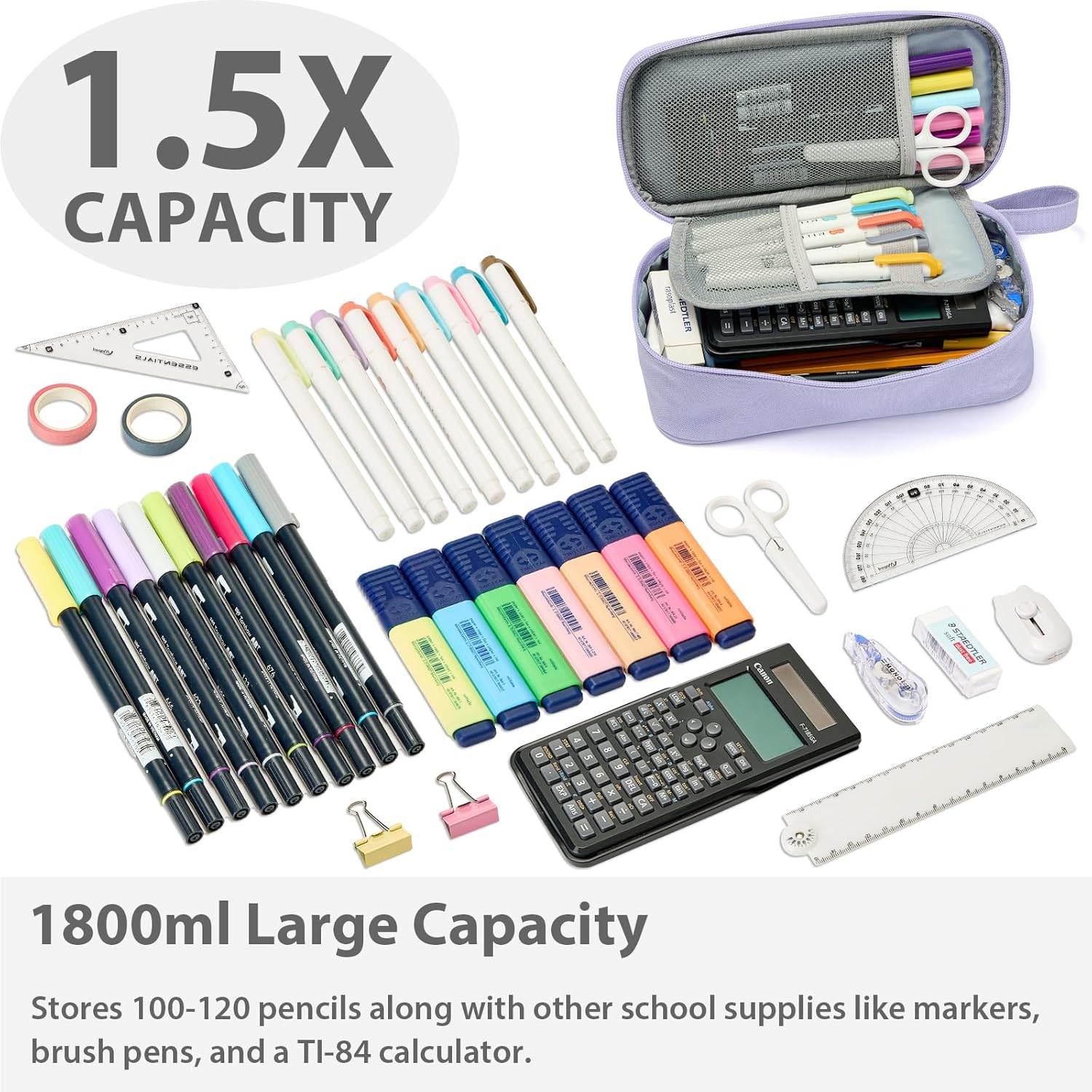 - SPACEMATE pouches have a capacity of 1800ml, is 1.8 times more than others (1000ml). It is easy to store 100 pencil, and also can store many kinds of school supplies, such as markers, brush pen, ruler, small notebooks, charger and TI-84 calculator.