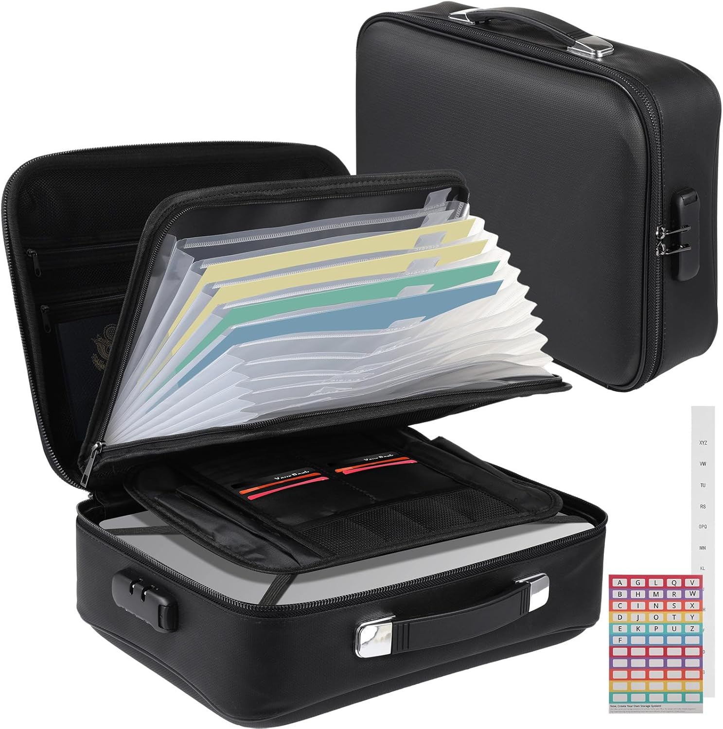 Fireproof Document Box with Lock, Hard Shell Fireproof Safe Case, File Organizer with Expandable Filing Compartments, Portable & Waterproof Storage Box for Home Travel