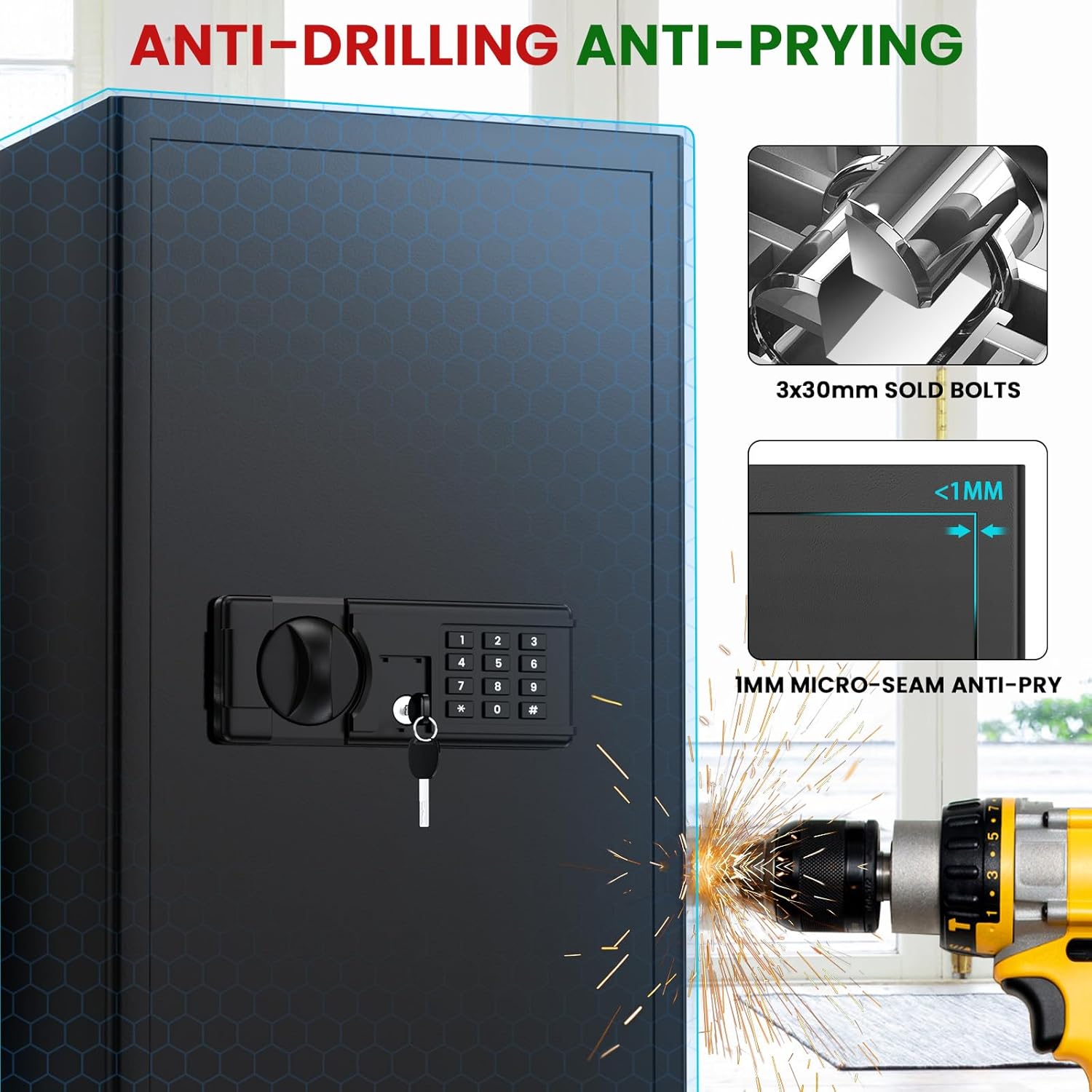 - Digital Safe with Combination Lock: Our heavy-duty safe features triple access methods: (1) Programmable digital keypad for keyless entry, (2) Emergency backup keys, and (3) External power backup port for dead battery scenarios. Designed with anti-tamper coding technology, it eliminates key management concerns while providing instant access to valuables.