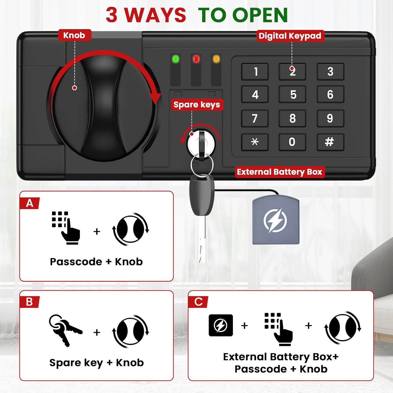 - 3 Ways to Unlock: Access your safe instantly via digital keypad with 3-8 digit code (no key required). For emergencies, use the included spare key or power the keypad externally when batteries die - no memory or internal power needed for entry.