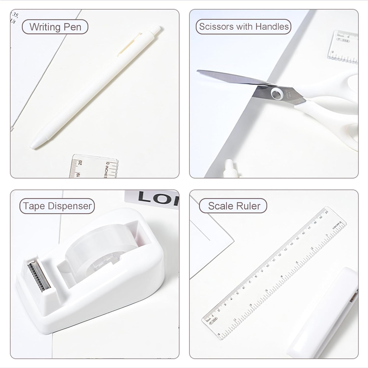 Desk Accessories with Pen Holder, Office Supplies Desk Organizers and Accessories, Tape Dispenser, Stapler, Staple Remover, Staples, Clips Set, Ruler, Scissor, Pen, Tape (White)