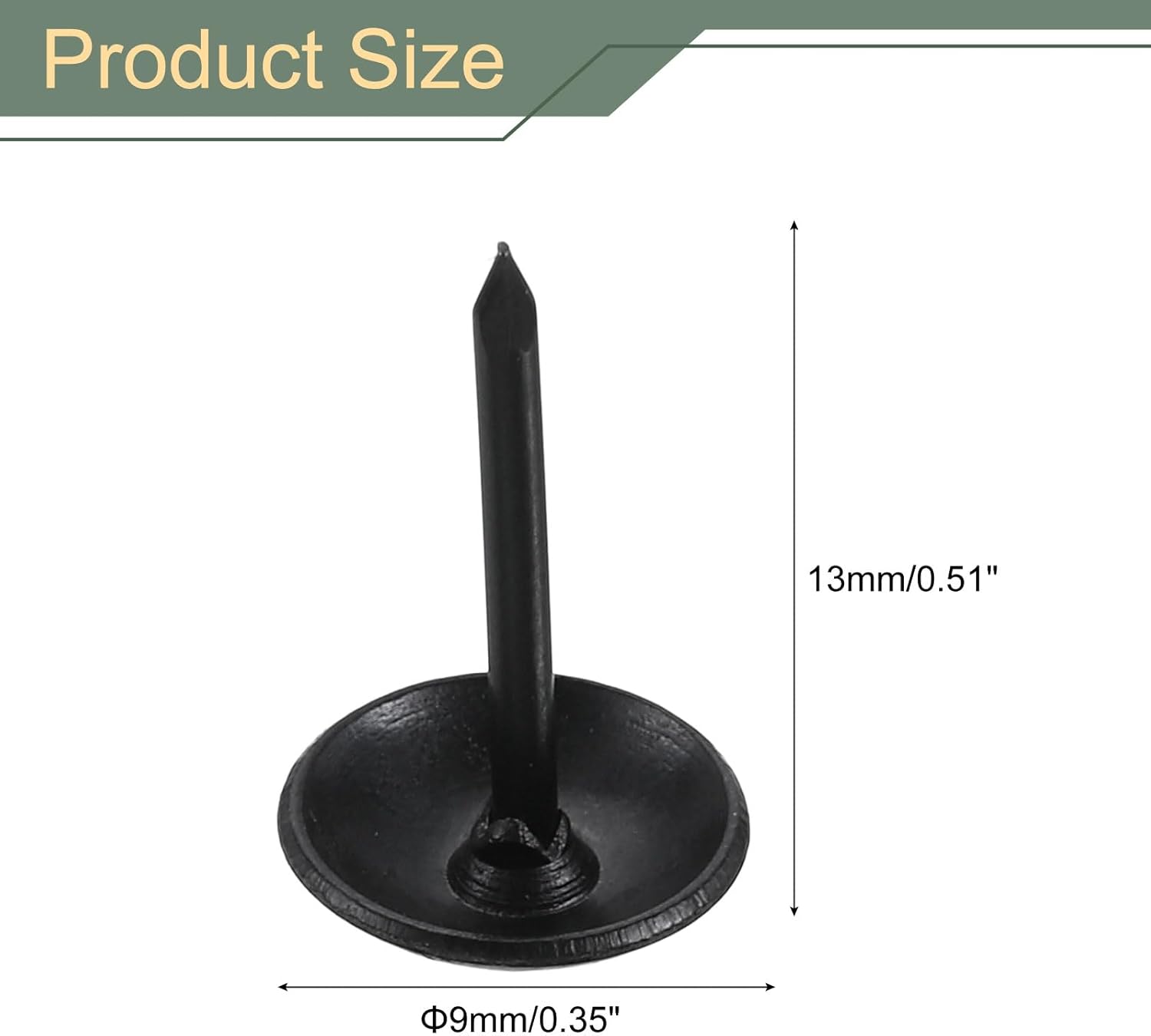 - What You Get - The package comes with 50 pieces of upholstery tacks, with the total height is 13mm/0.51inch, the head diameter is 9mm/0.35inch.