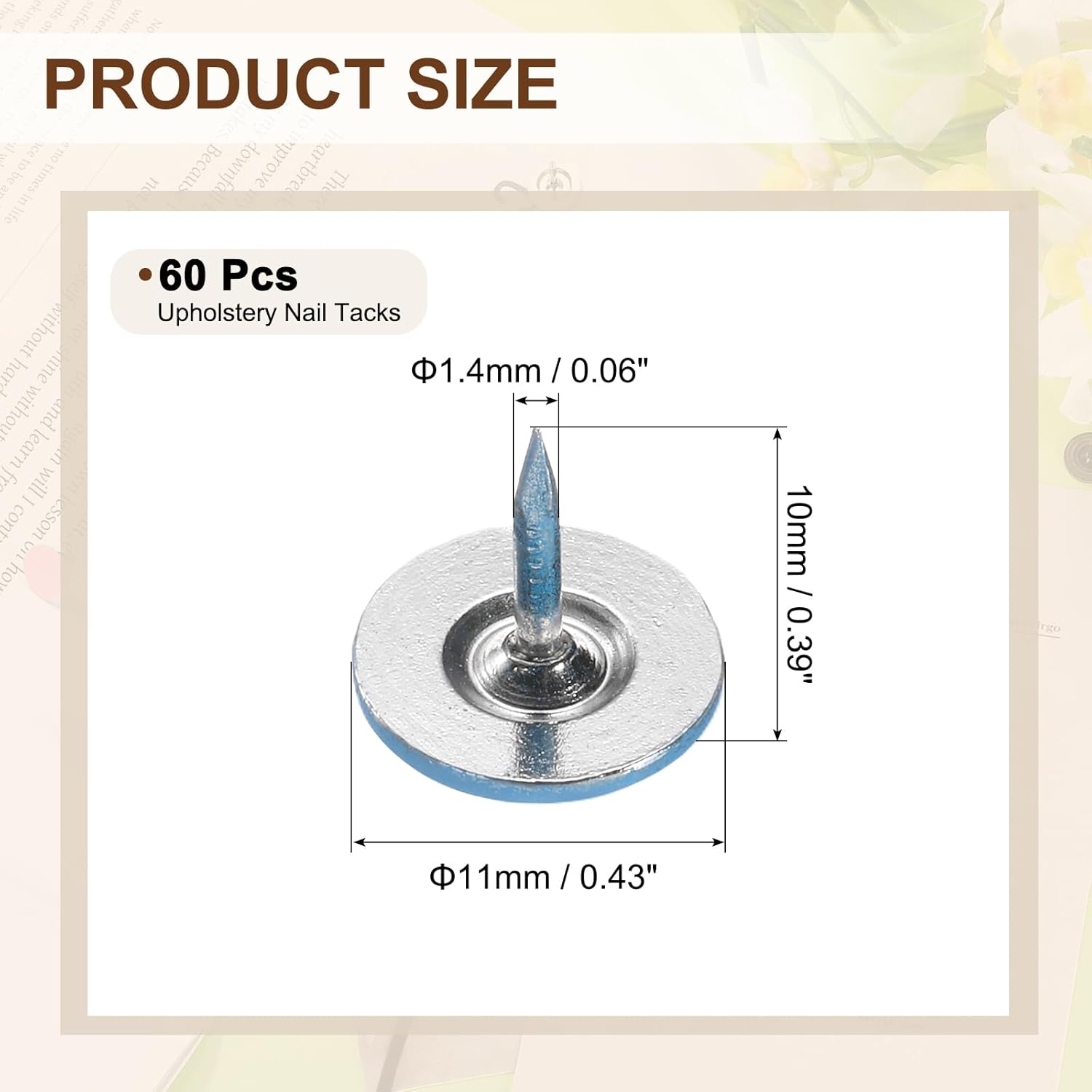 - [Size & Quantity] - The package comes with 60pcs decorative upholstery tacks. Sufficient quantity to meet your different daily needs. The overall size of upholstery nails is about 11mm x 10mm/0.43-inch x 0.39-inch(D*H)