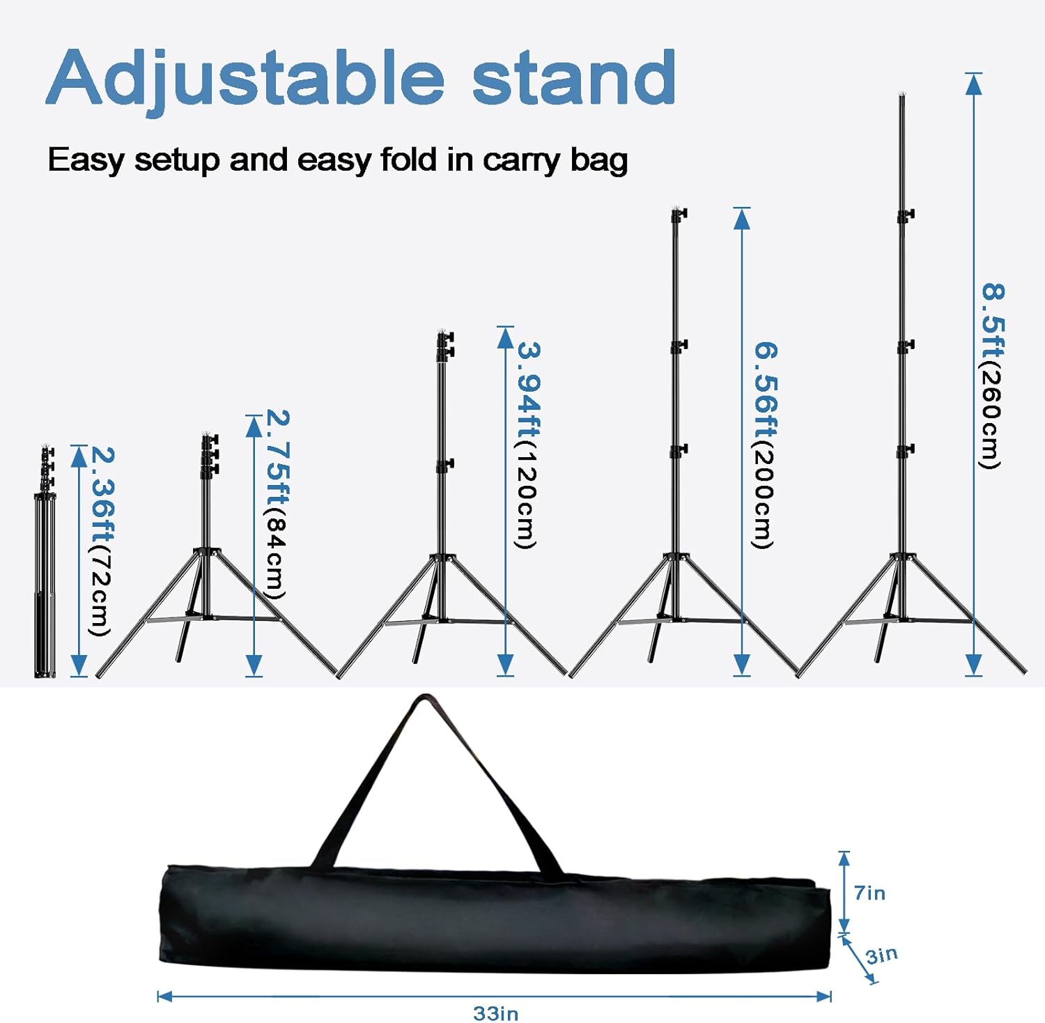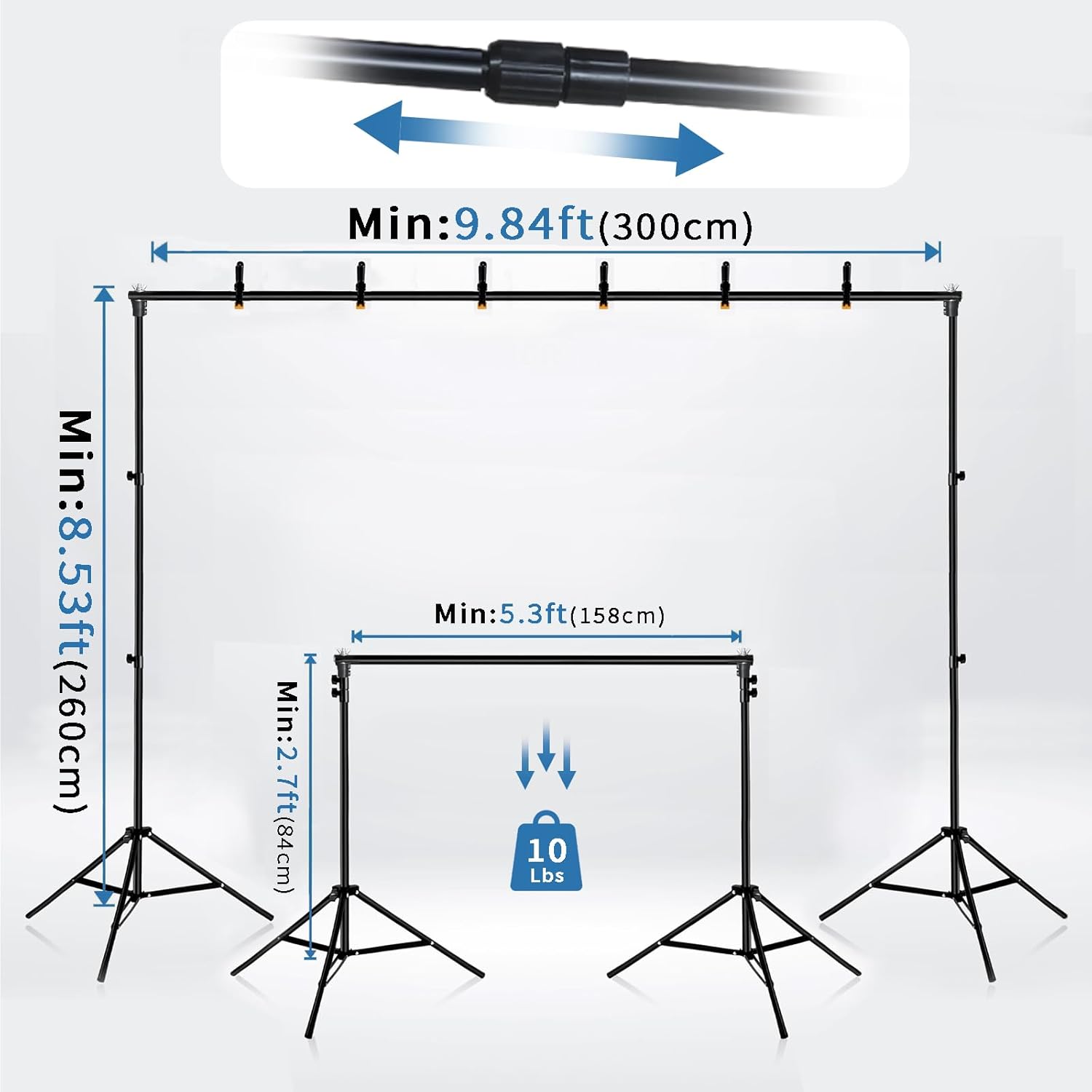 - SMART SIZE ADJUSTMENT:Featuring a high-resilience crossbar, this backdrop stand offers seamless height adjustment (2-8.5 ft) and width customization (3.85-10 ft), effortlessly adapting to any backdrop size. To preserve aesthetics and structure, keep hanging items under 10 lbs (4.5 kg) for wrinkle-free visuals.