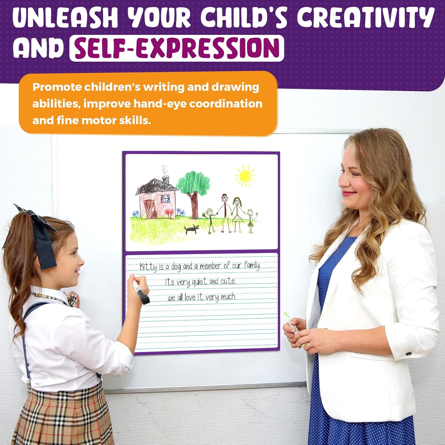 - Unleash Your Child's Creativity and Self-expression: This magnetic teaching chart is half page drawing and half-page writing space. Drawing helps kids improve concentration, encourages creativity, and expresses feelings. Writing helps with hand-eye coordination and fine motor skills. Perfect for younger children who start to learn writing and encourages kids to tell their stories and practice writing at the same time
