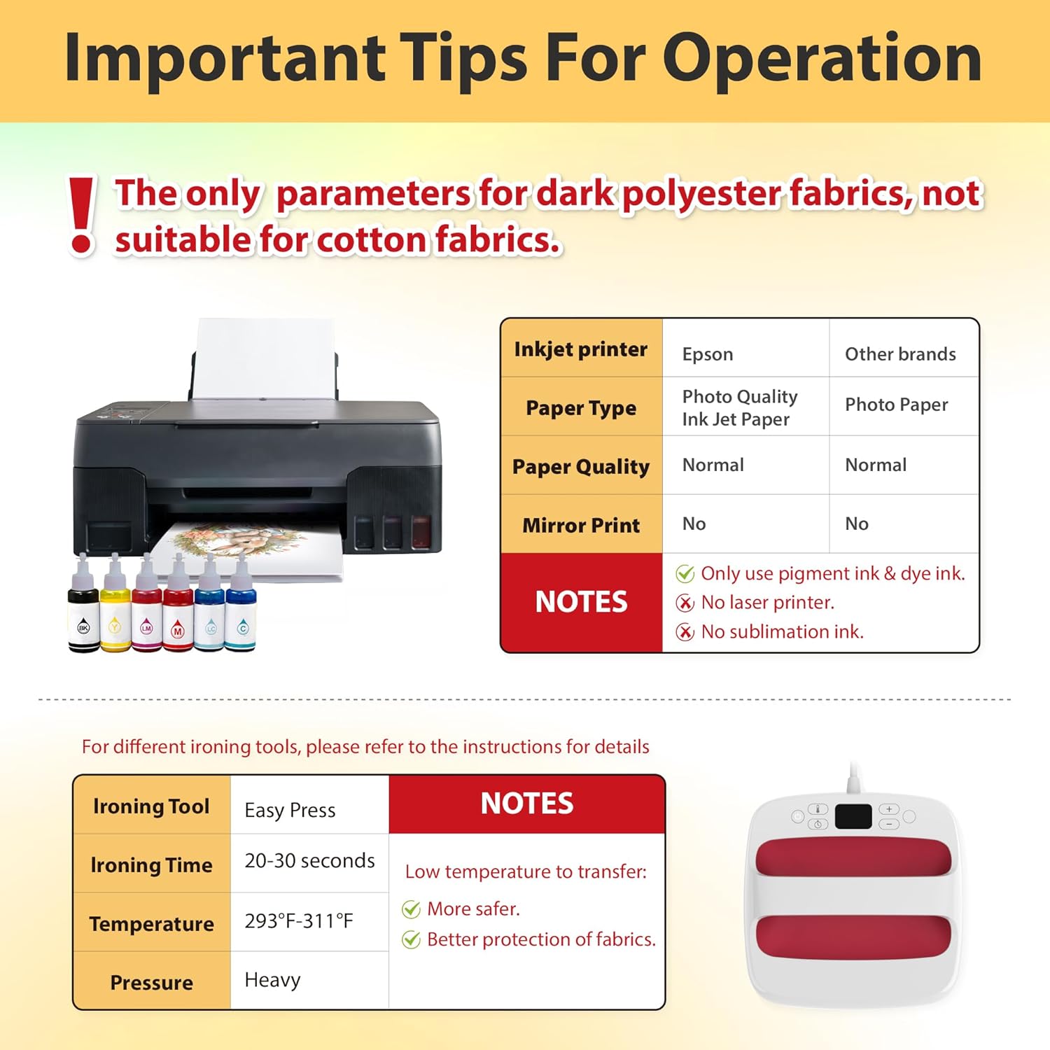 - 💕ADVANTAGES: DARK-X is compatible with regular Inkjet Printers and does not require sublimation equipment to sublimate your personalized designs onto Dark polyester fabrics. DARK-X does not require you to purchase expensive and unstable sublimation ink. You can use dye ink or pigment ink, which is cost-saving and more stable.No mirror printing.Easy to be cut by scissors, and also compatible with cutting machines, such as Silhouette and more. Low temperature transfer is safer.The colors are bright,vivid and true to your original design after transfer. DARK-X is durable and machine washable after transfer. (No tumble dry).