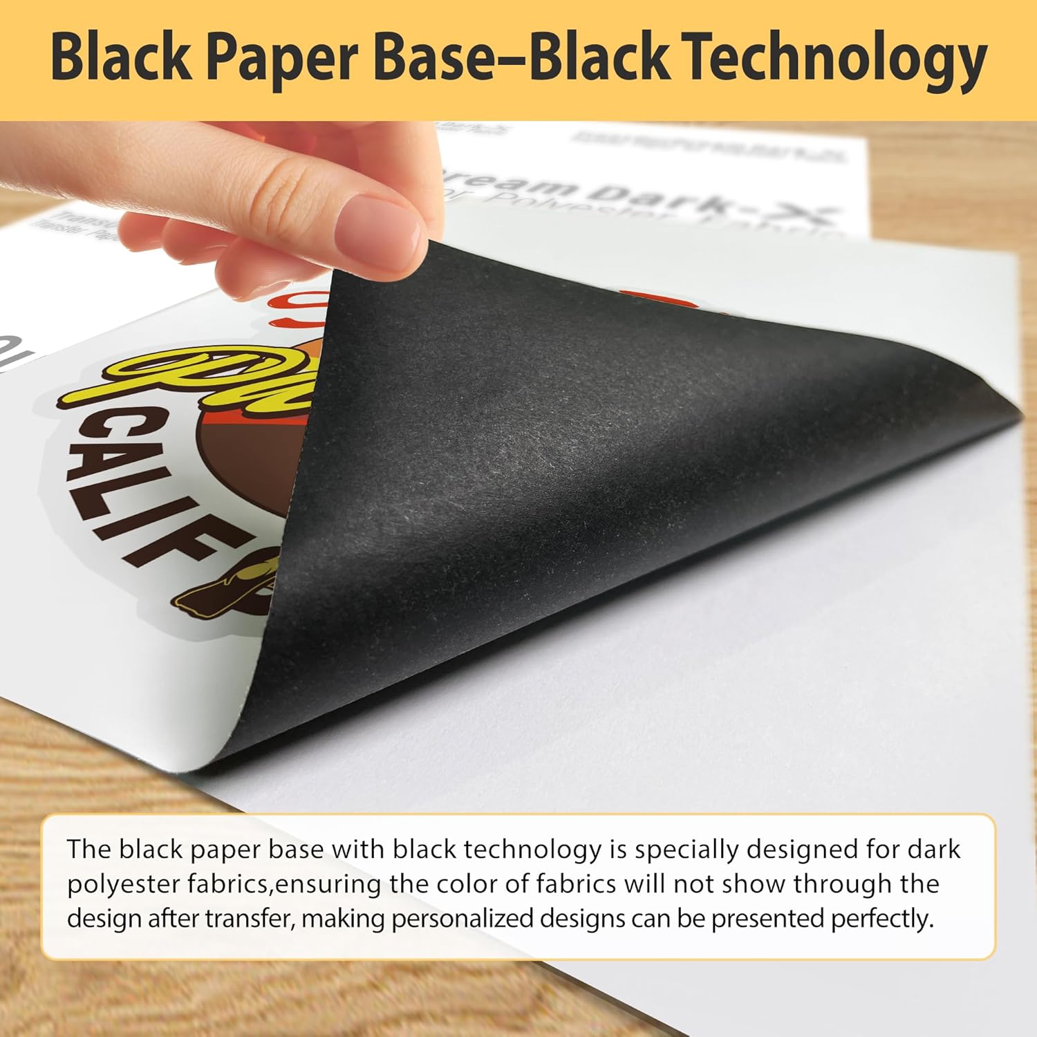 - 💕SPECIALLY DESIGNED FOR POLYESTER FABRICS: Dark-X is a Dark transfer paper specially developed for Dark polyester fabrics. Its high-tech black film base provides a perfect solution for the transfer of Dark polyester fabrics. DARK-X is thin, soft and has a natural touch.Our advanced and unique formula guarantees the transfers vibrant, soft and durable. It allows you to have unlimited creativity and easily transfer various personalized designs. DARK-X is not applicable for cotton fabrics. (Notes: For Dark cotton fabrics, we strongly recommend that you choose TransOurDream Dark Heat Transfer Paper .)
